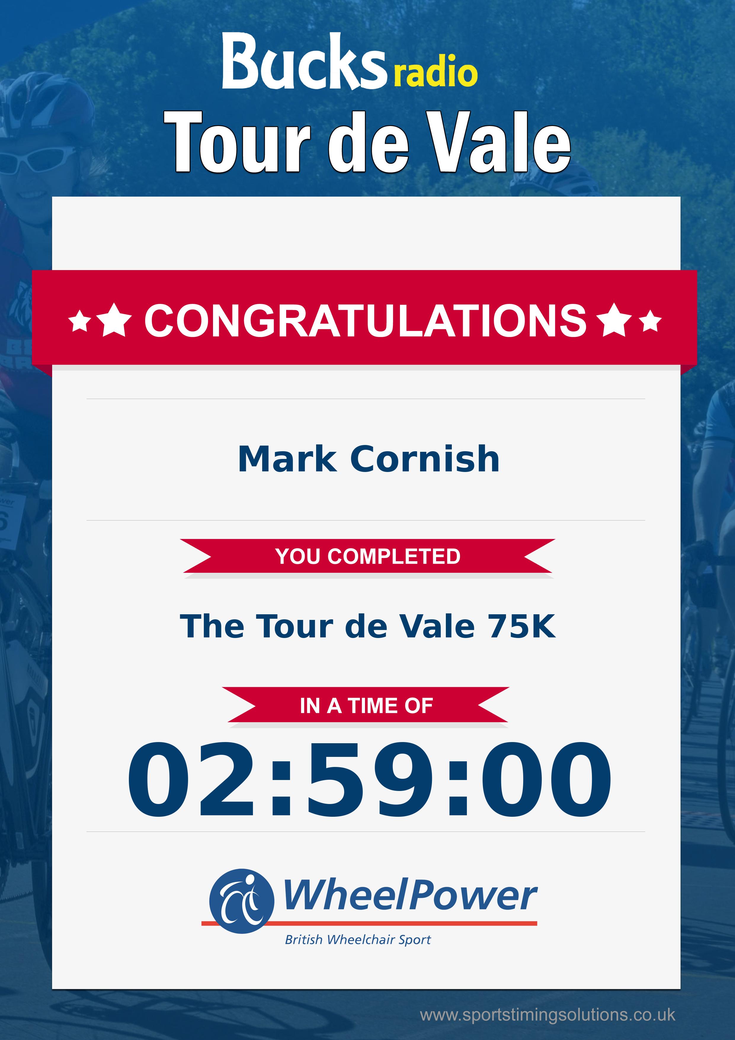 Congratulations Mark Cornish after completing The Bucks Radio Tour De Vale Sportive 2023 why not remember your accomplishment by purchasing a professionally printed, high quality 11oz mug. Keep that lasting memory forever.