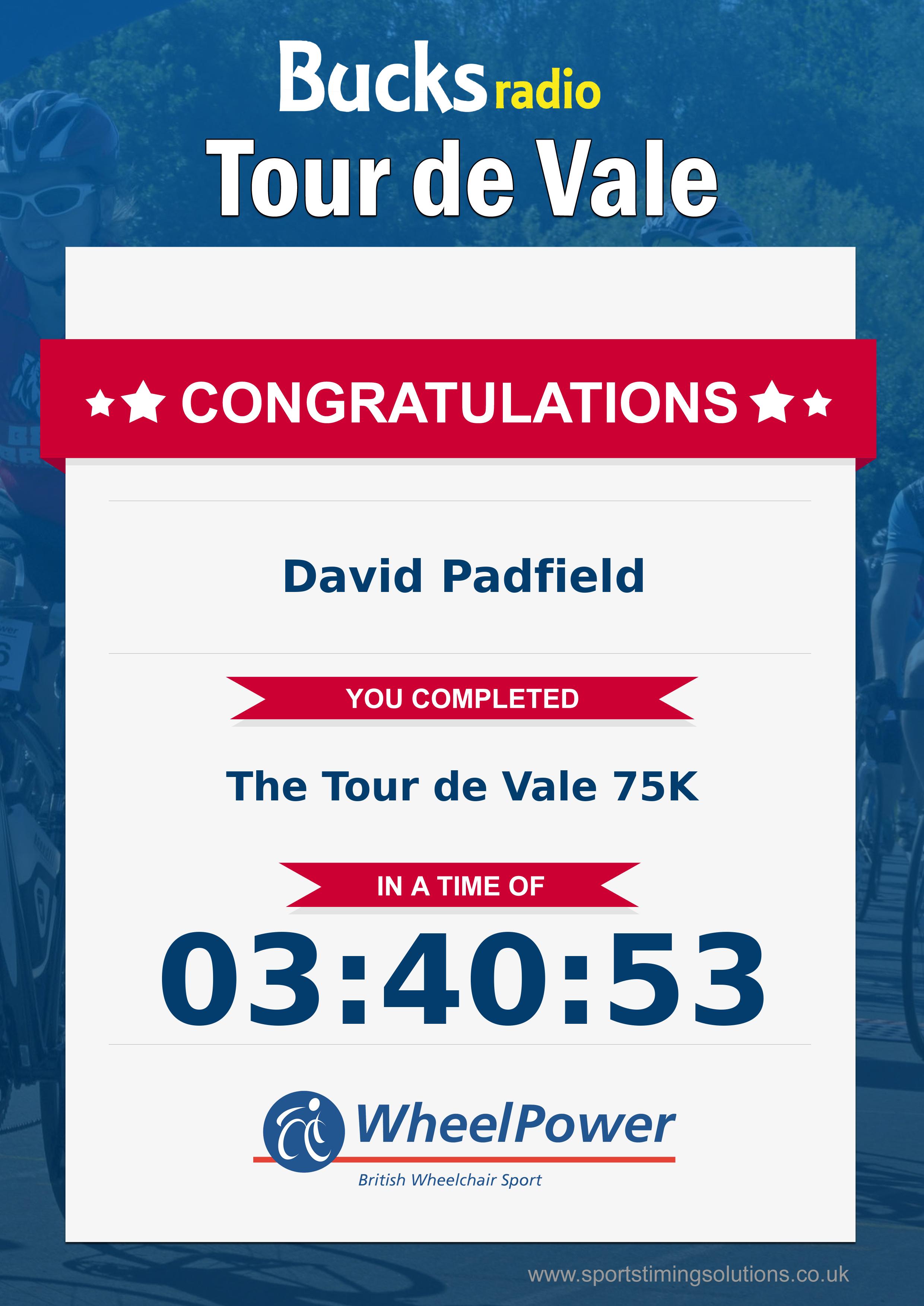 Congratulations David Padfield after completing The Bucks Radio Tour De Vale Sportive 2023 why not remember your accomplishment by purchasing a professionally printed, high quality 11oz mug. Keep that lasting memory forever.