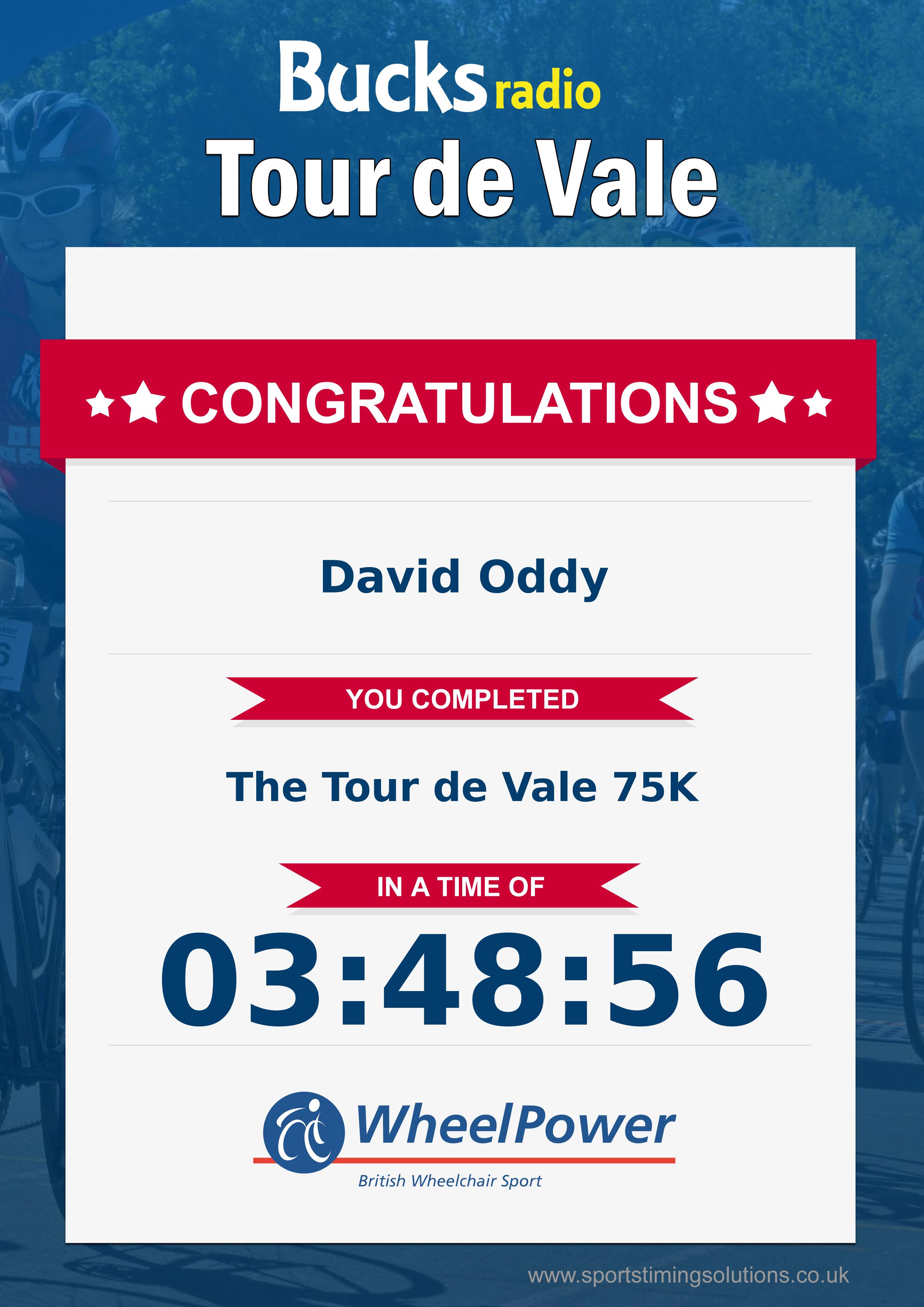 Congratulations David Oddy after completing The Bucks Radio Tour De Vale Sportive 2023 why not remember your accomplishment by purchasing a professionally printed, high quality 11oz mug. Keep that lasting memory forever.