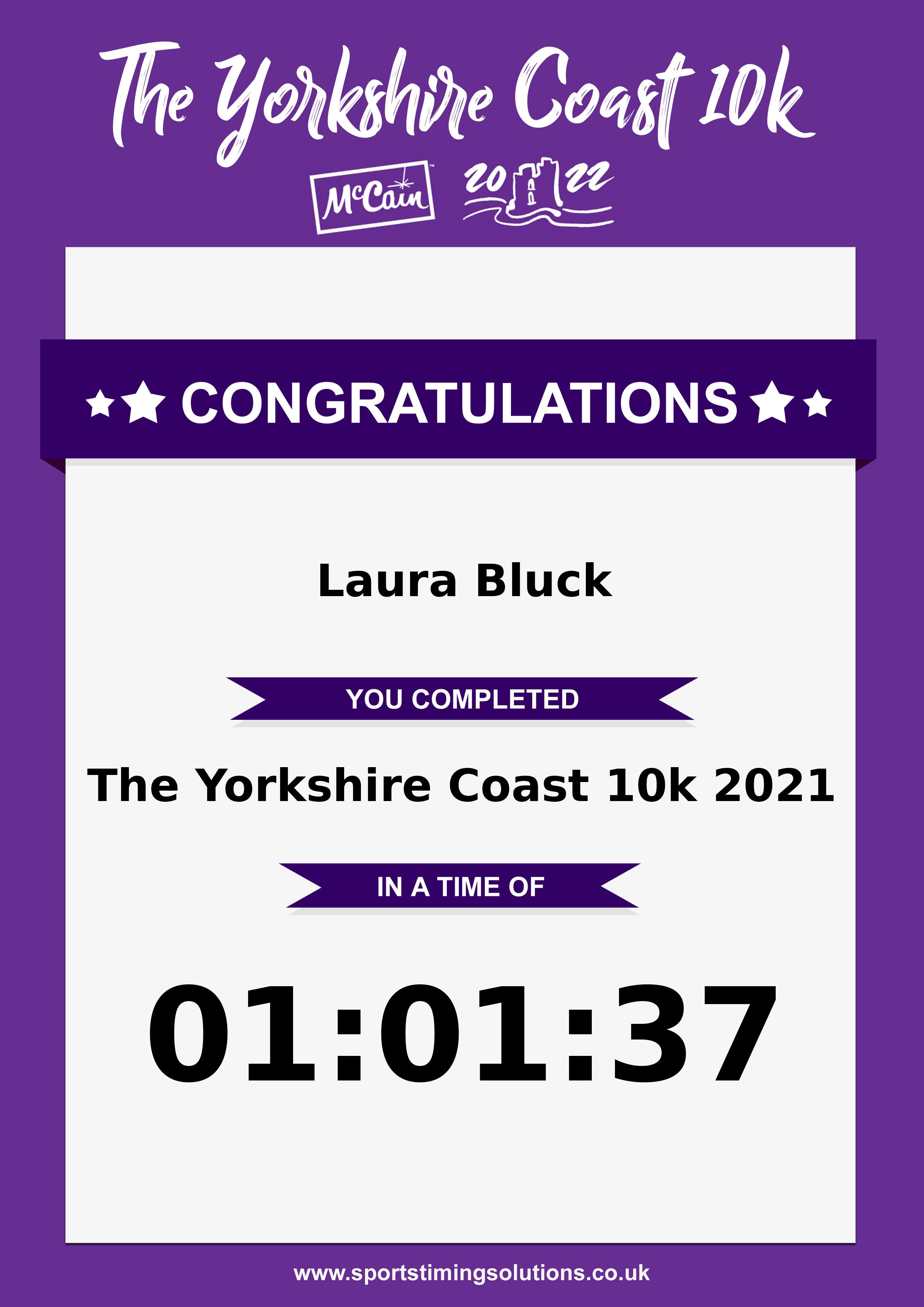 Congratulations Laura Bluck after completing The Yorkshire Coast 10k 2021 why not remember your accomplishment by purchasing our unique professionally printed, high quality 11oz race results mug. Keep that lasting memory forever. All of our race mugs mugs are personally designed and made to order and ready to deliver within 5–10 business days. Although our mugs are dishwasher safe the high temperatures of the dishwasher can fade the images. We advise handwashing only.Delivery is £3.50 Includes P&P. We only deliver within the UK