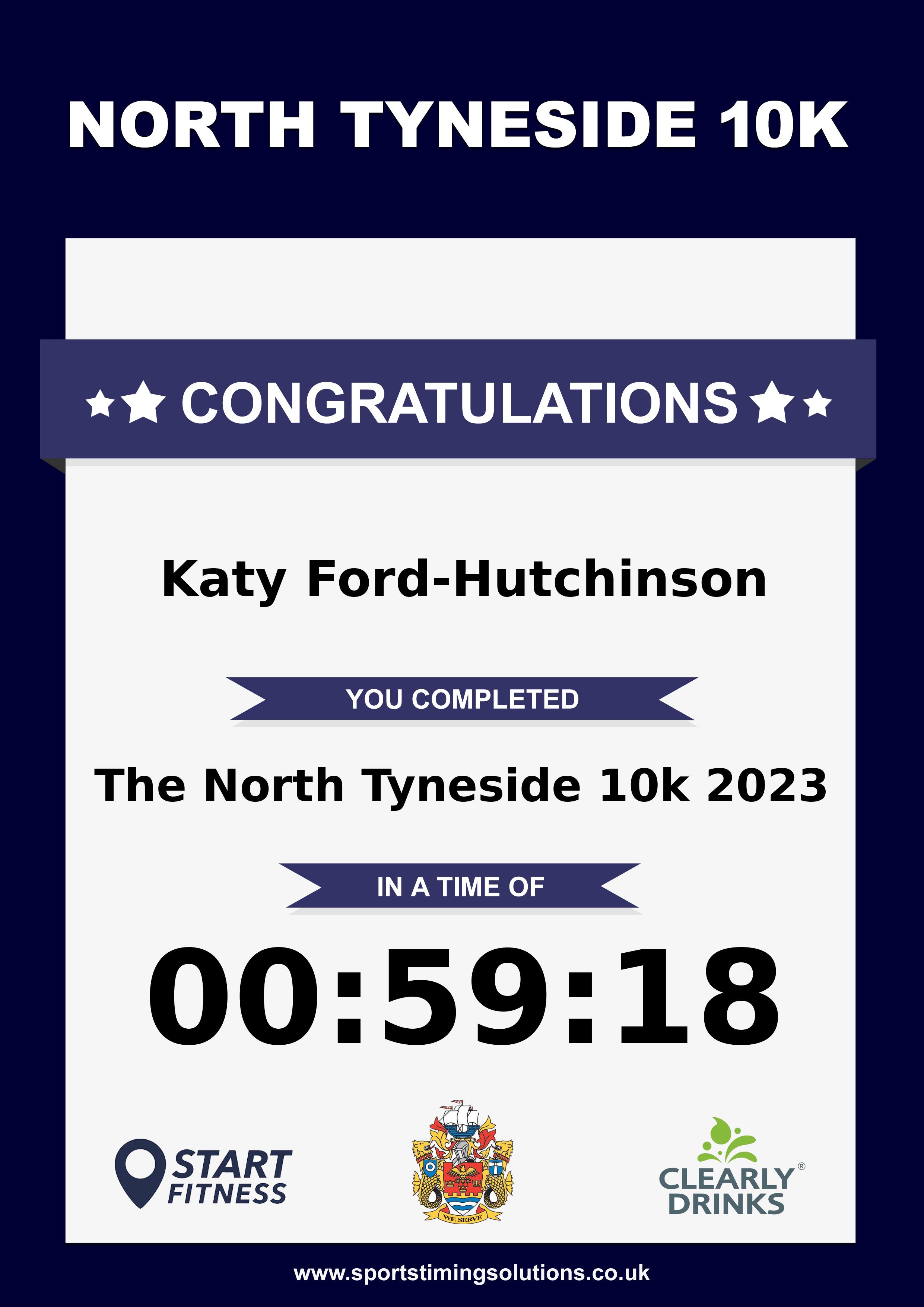 Congratulations Katy Ford-Hutchinson after completing The North Tyneside 10k 2023 why not remember your accomplishment by purchasing our unique professionally printed, high quality 11oz race results mug. Keep that lasting memory forever. All of our race mugs mugs are personally designed and made to order and ready to deliver within 5–10 business days. Although our mugs are dishwasher safe the high temperatures of the dishwasher can fade the images. We advise handwashing only.Delivery is £3.50 Includes P&P. We only deliver within the UK
