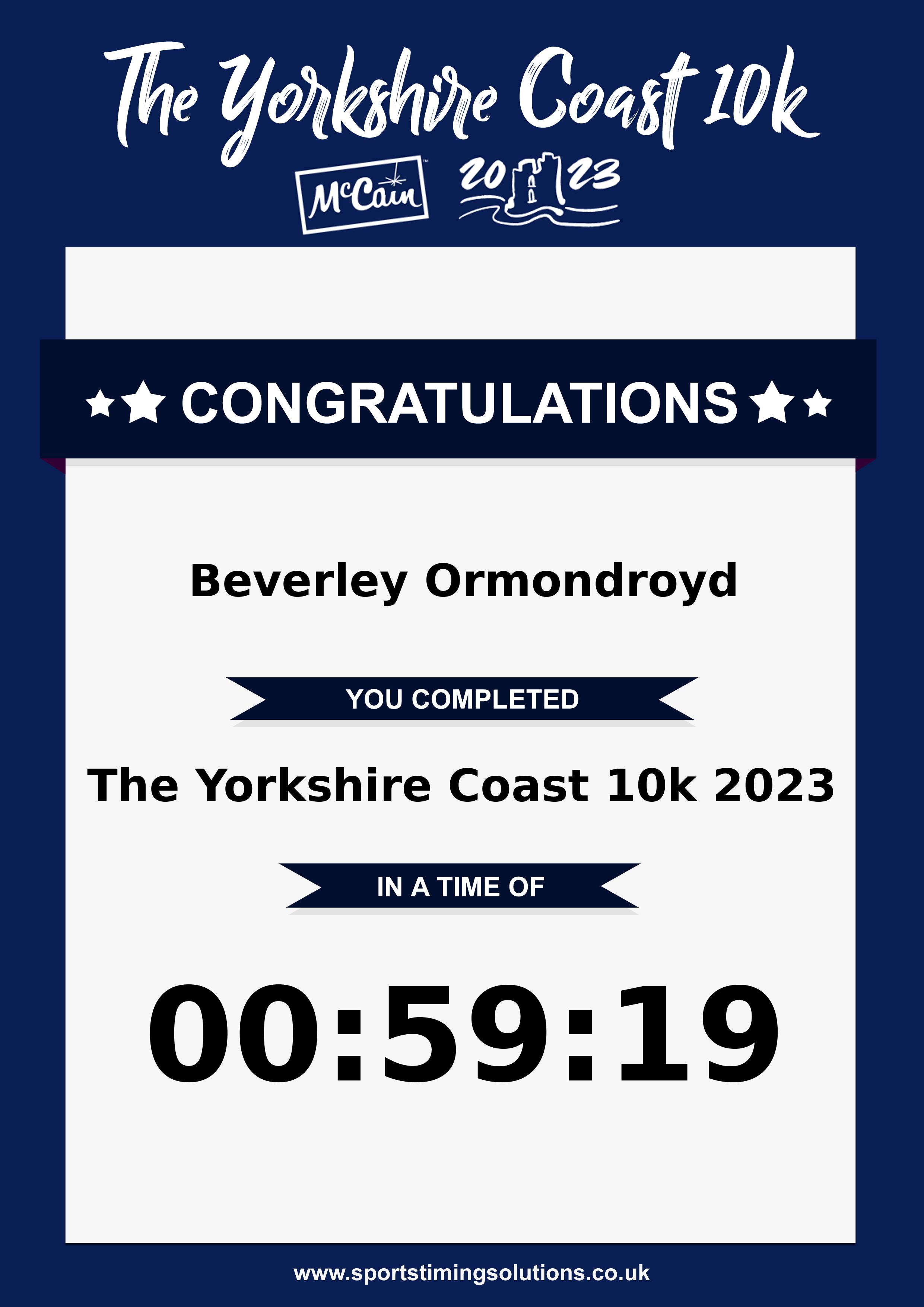 Congratulations Beverley Ormondroyd after completing The Yorkshire Coast 10k 2023 why not remember your accomplishment by purchasing our unique professionally printed, high quality 11oz race results mug. Keep that lasting memory forever. All of our race mugs mugs are personally designed and made to order and ready to deliver within 5–10 business days. Although our mugs are dishwasher safe the high temperatures of the dishwasher can fade the images. We advise handwashing only.Delivery is £3.50 Includes P&P. We only deliver within the UK