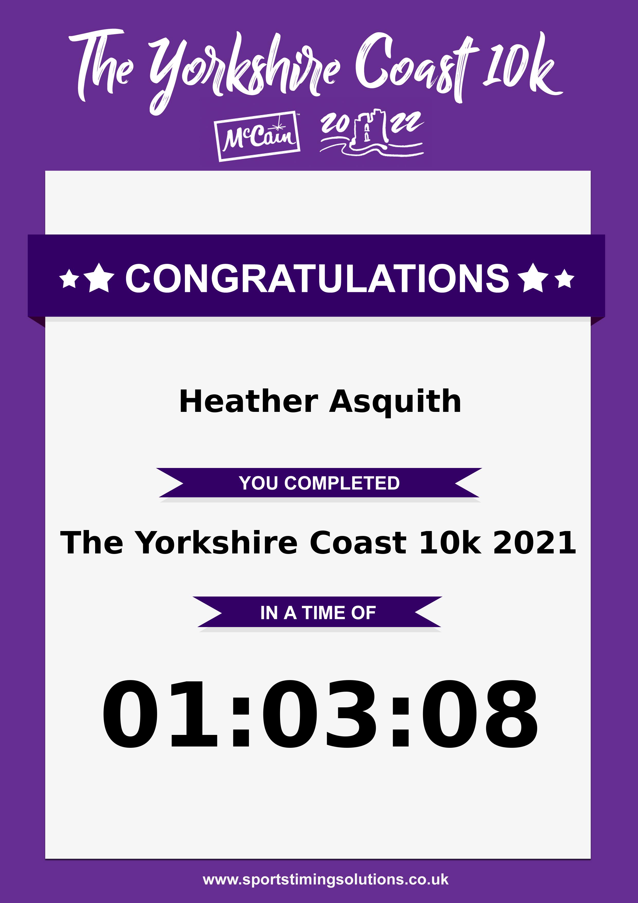 Congratulations Heather Asquith after completing The Yorkshire Coast 10k 2021 why not remember your accomplishment by purchasing our unique professionally printed, high quality 11oz race results mug. Keep that lasting memory forever. All of our race mugs mugs are personally designed and made to order and ready to deliver within 5–10 business days. Although our mugs are dishwasher safe the high temperatures of the dishwasher can fade the images. We advise handwashing only.Delivery is £3.50 Includes P&P. We only deliver within the UK