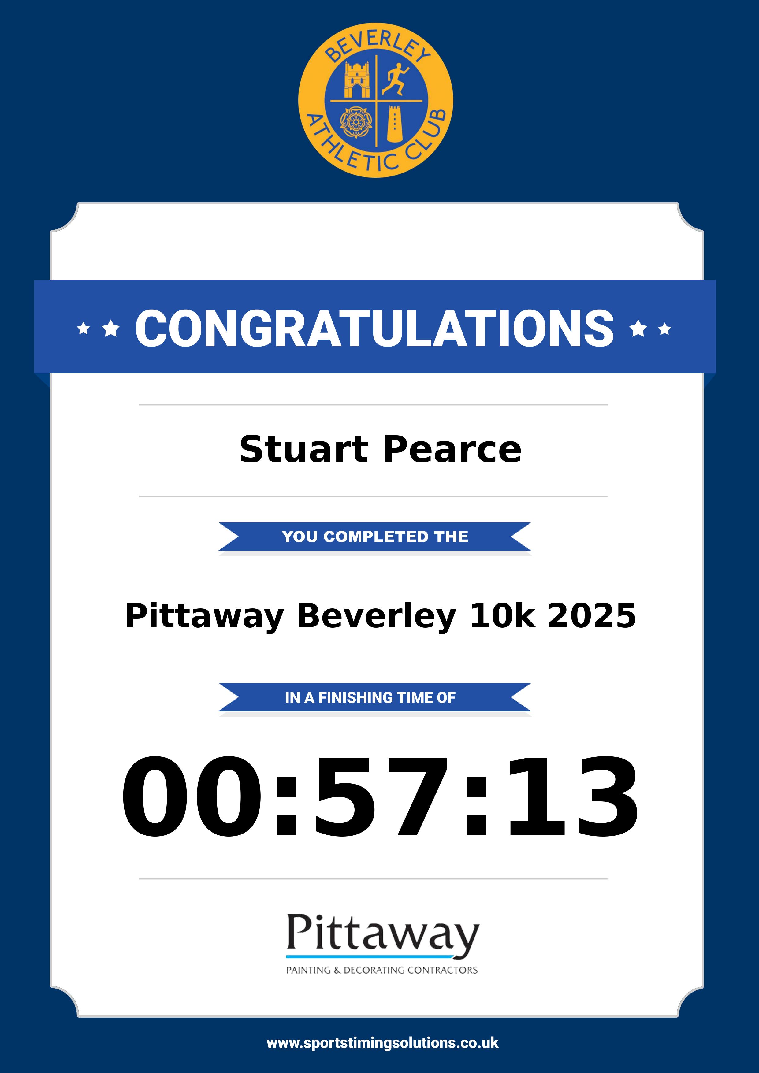 Congratulations Stuart Pearce after completing Pittaway Beverley 10k 2025 why not remember your accomplishment by purchasing our unique professionally printed, high quality 11oz race results mug. Keep that lasting memory forever. All of our race mugs mugs are personally designed and made to order and ready to deliver within 5–10 business days. Although our mugs are dishwasher safe the high temperatures of the dishwasher can fade the images. We advise handwashing only.Delivery is £3.50 Includes P&P. We only deliver within the UK