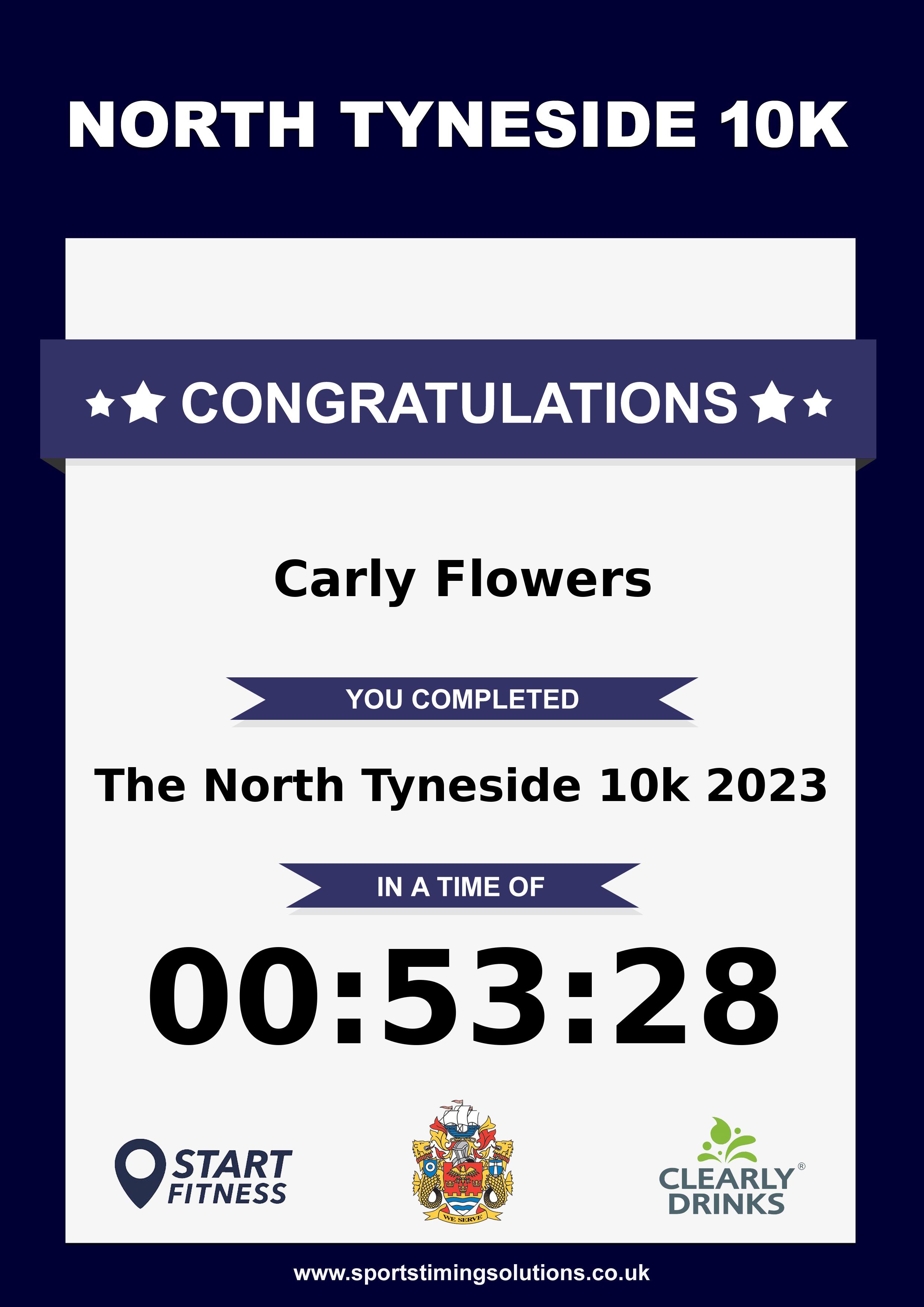 Congratulations Carly Flowers after completing The North Tyneside 10k 2023 why not remember your accomplishment by purchasing our unique professionally printed, high quality 11oz race results mug. Keep that lasting memory forever. All of our race mugs mugs are personally designed and made to order and ready to deliver within 5–10 business days. Although our mugs are dishwasher safe the high temperatures of the dishwasher can fade the images. We advise handwashing only.Delivery is £3.50 Includes P&P. We only deliver within the UK