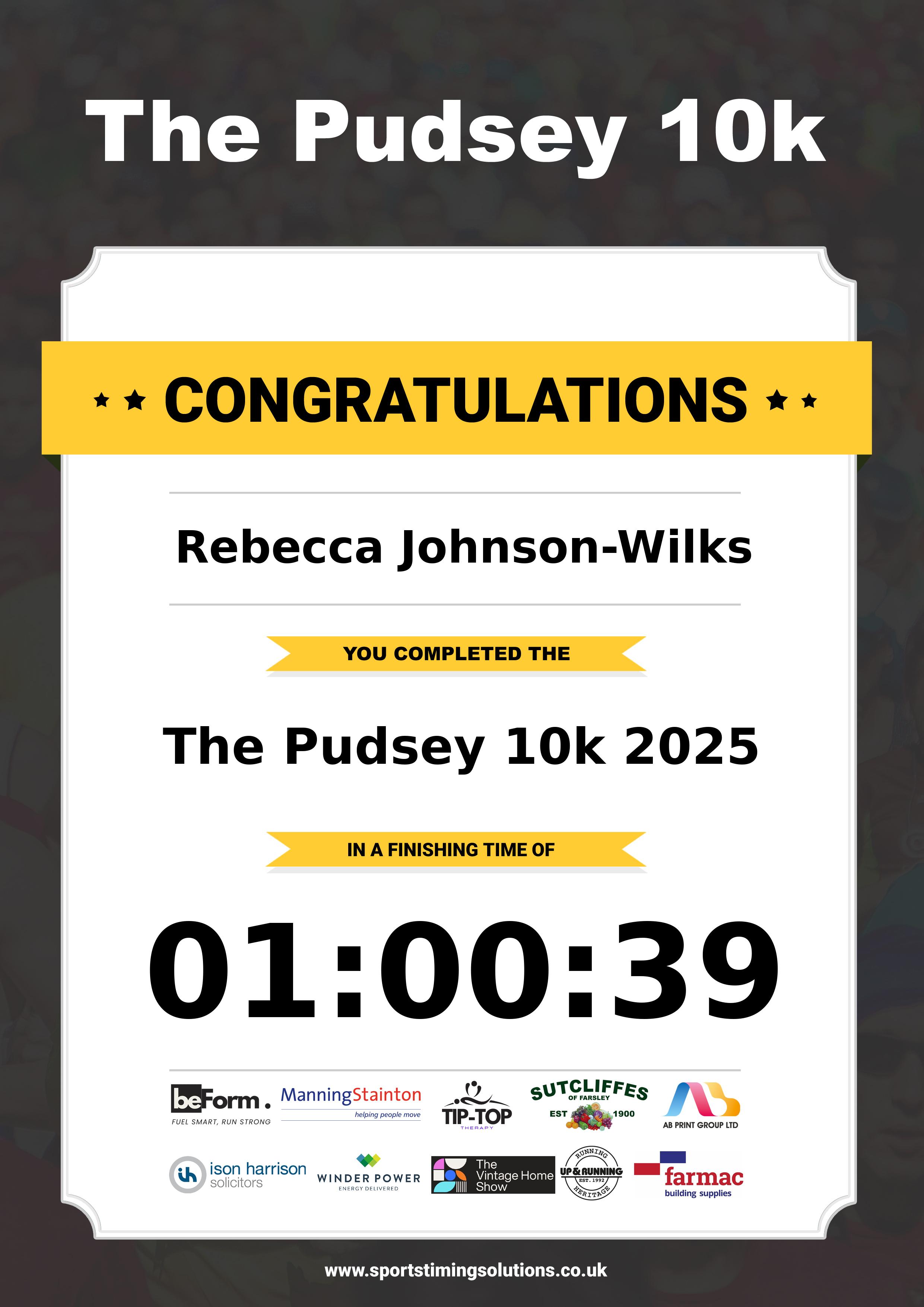 Congratulations Rebecca Johnson-Wilks after completing The Pudsey 10k 2025 why not remember your accomplishment by purchasing our unique professionally printed, high quality 11oz race results mug. Keep that lasting memory forever. All of our race mugs mugs are personally designed and made to order and ready to deliver within 5–10 business days. Although our mugs are dishwasher safe the high temperatures of the dishwasher can fade the images. We advise handwashing only.Delivery is £3.50 Includes P&P. We only deliver within the UK