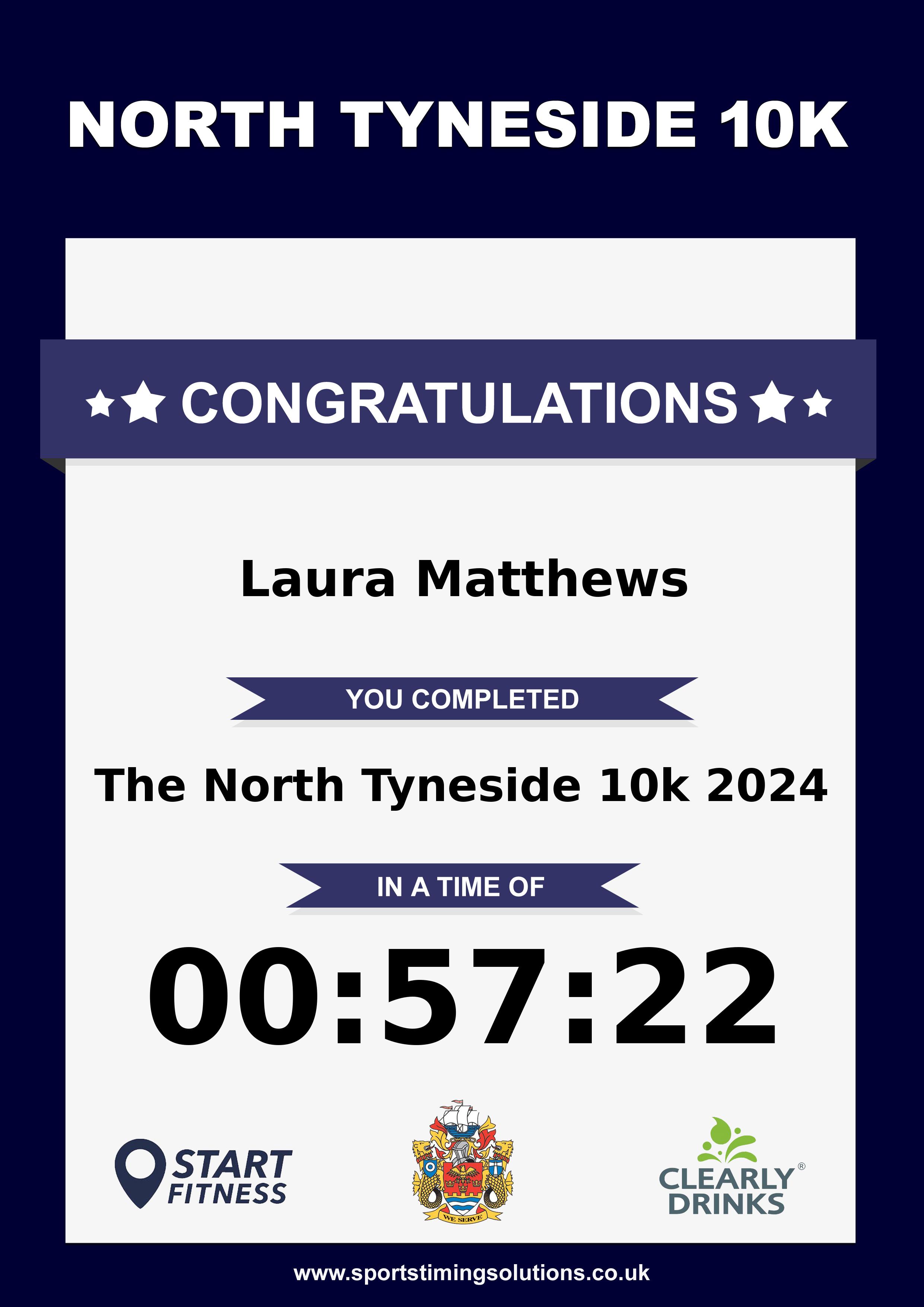 Congratulations Laura Matthews after completing The North Tyneside 10k 2024 why not remember your accomplishment by purchasing our unique professionally printed, high quality 11oz race results mug. Keep that lasting memory forever. All of our race mugs mugs are personally designed and made to order and ready to deliver within 5–10 business days. Although our mugs are dishwasher safe the high temperatures of the dishwasher can fade the images. We advise handwashing only.Delivery is £3.50 Includes P&P. We only deliver within the UK
