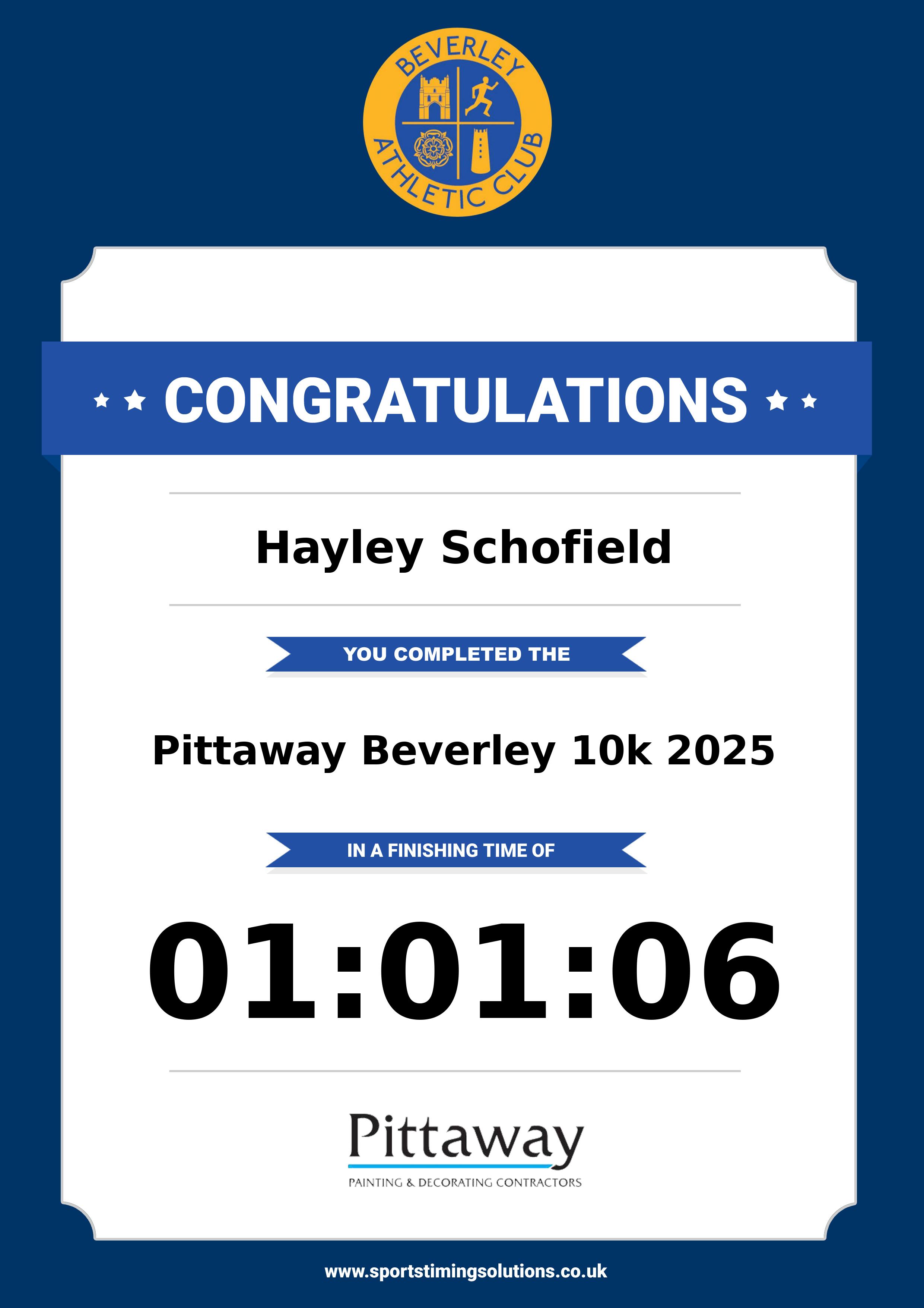 Congratulations Hayley Schofield after completing Pittaway Beverley 10k 2025 why not remember your accomplishment by purchasing our unique professionally printed, high quality 11oz race results mug. Keep that lasting memory forever. All of our race mugs mugs are personally designed and made to order and ready to deliver within 5–10 business days. Although our mugs are dishwasher safe the high temperatures of the dishwasher can fade the images. We advise handwashing only.Delivery is £3.50 Includes P&P. We only deliver within the UK