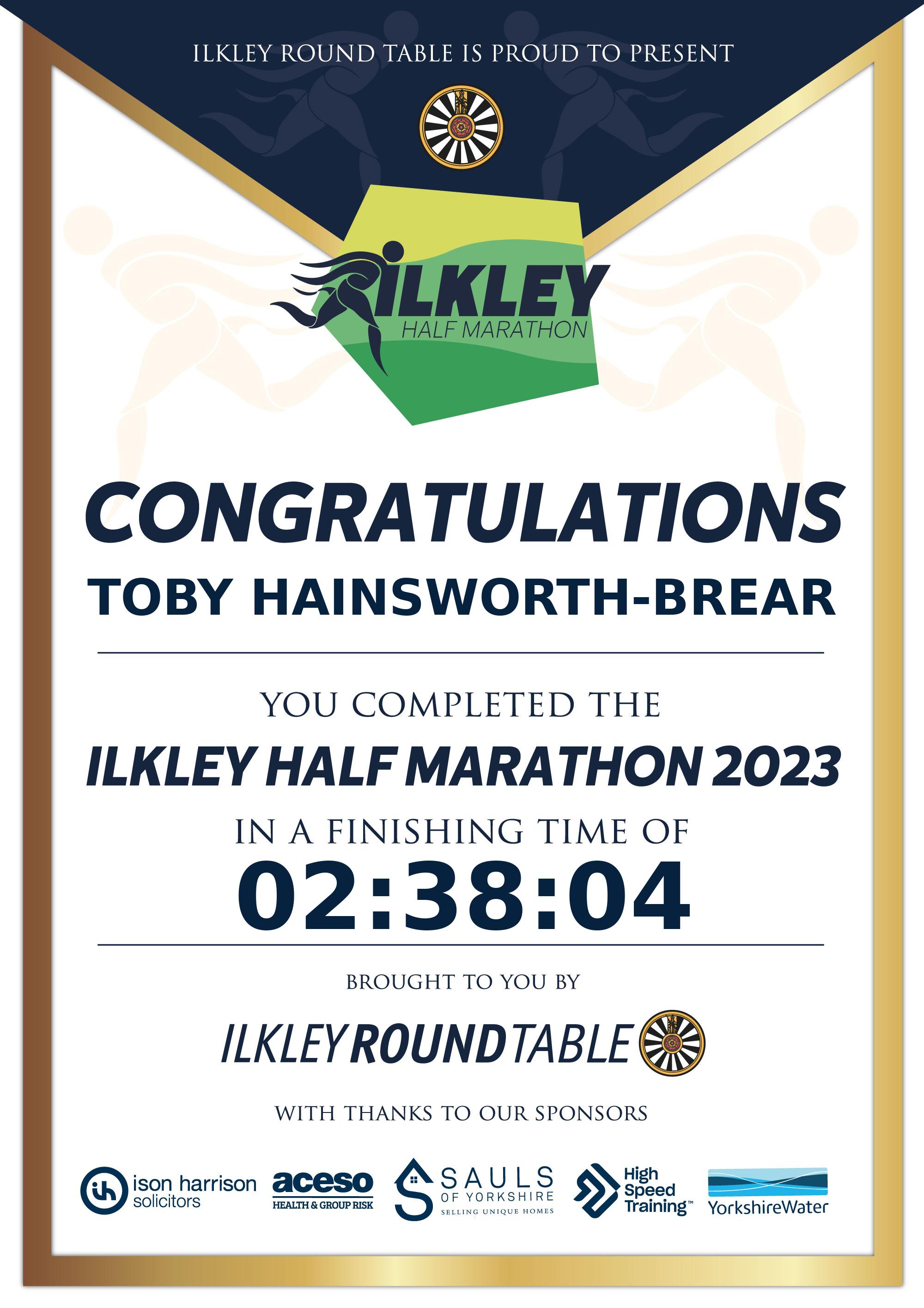 Congratulations Toby Hainsworth-Brear after completing The Ilkley Half Marathon 2023 why not remember your accomplishment by purchasing our unique professionally printed, high quality 11oz race results mug. Keep that lasting memory forever. All of our race mugs mugs are personally designed and made to order and ready to deliver within 5–10 business days. Although our mugs are dishwasher safe the high temperatures of the dishwasher can fade the images. We advise handwashing only.Delivery is £3.50 Includes P&P. We only deliver within the UK