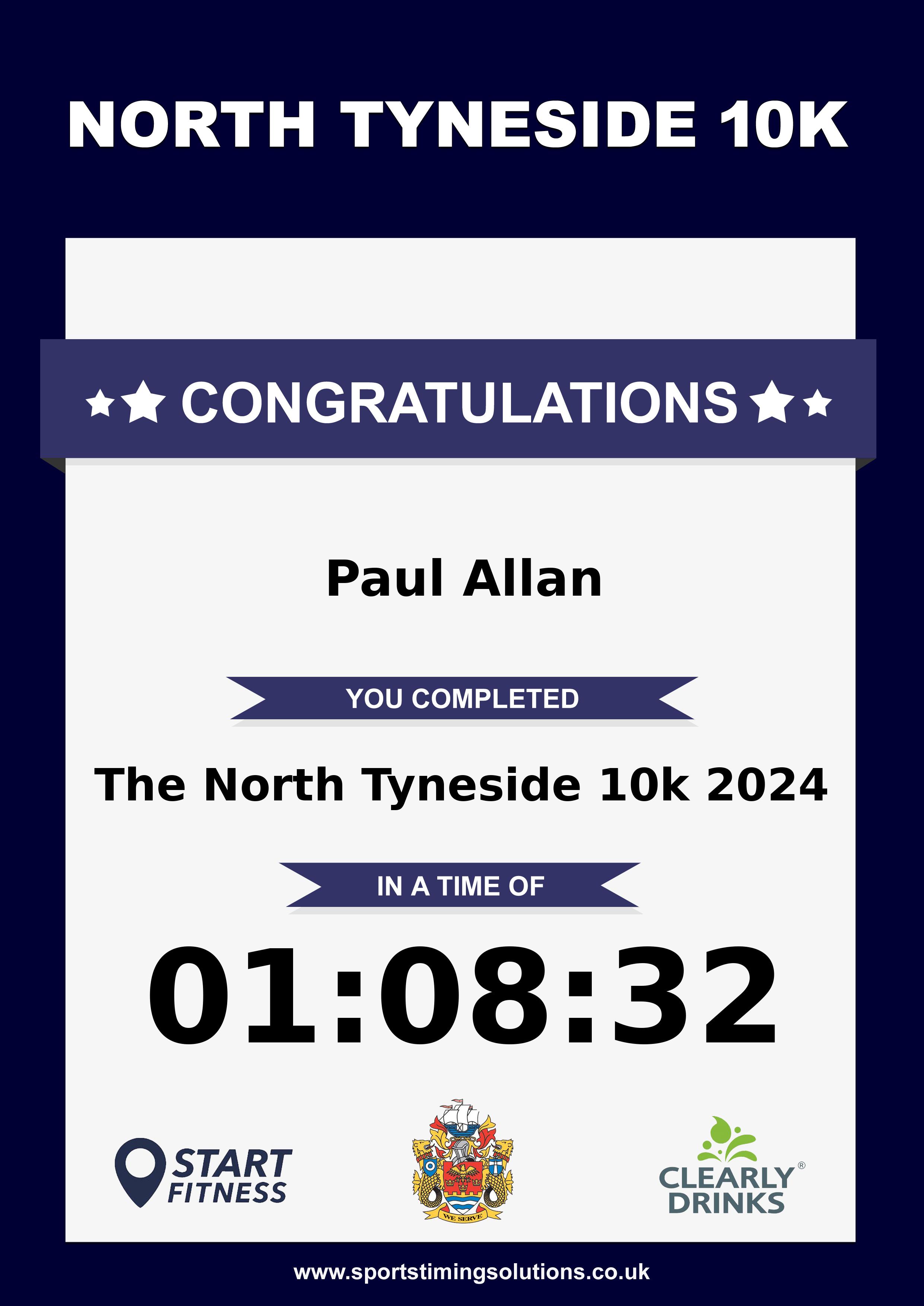 Congratulations Paul Allan after completing The North Tyneside 10k 2024 why not remember your accomplishment by purchasing our unique professionally printed, high quality 11oz race results mug. Keep that lasting memory forever. All of our race mugs mugs are personally designed and made to order and ready to deliver within 5–10 business days. Although our mugs are dishwasher safe the high temperatures of the dishwasher can fade the images. We advise handwashing only.Delivery is £3.50 Includes P&P. We only deliver within the UK