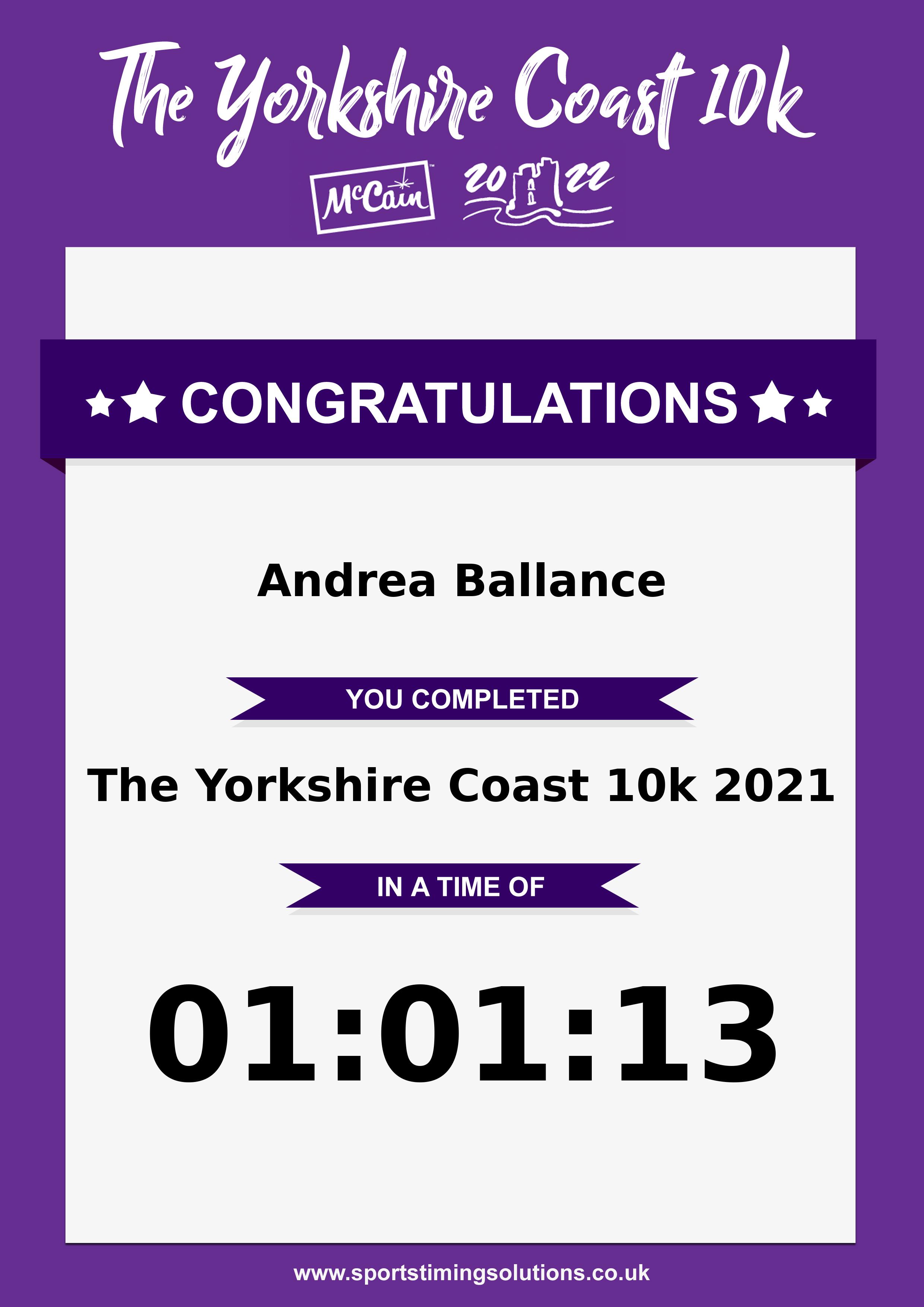 Congratulations Andrea Ballance after completing The Yorkshire Coast 10k 2021 why not remember your accomplishment by purchasing our unique professionally printed, high quality 11oz race results mug. Keep that lasting memory forever. All of our race mugs mugs are personally designed and made to order and ready to deliver within 5–10 business days. Although our mugs are dishwasher safe the high temperatures of the dishwasher can fade the images. We advise handwashing only.Delivery is £3.50 Includes P&P. We only deliver within the UK