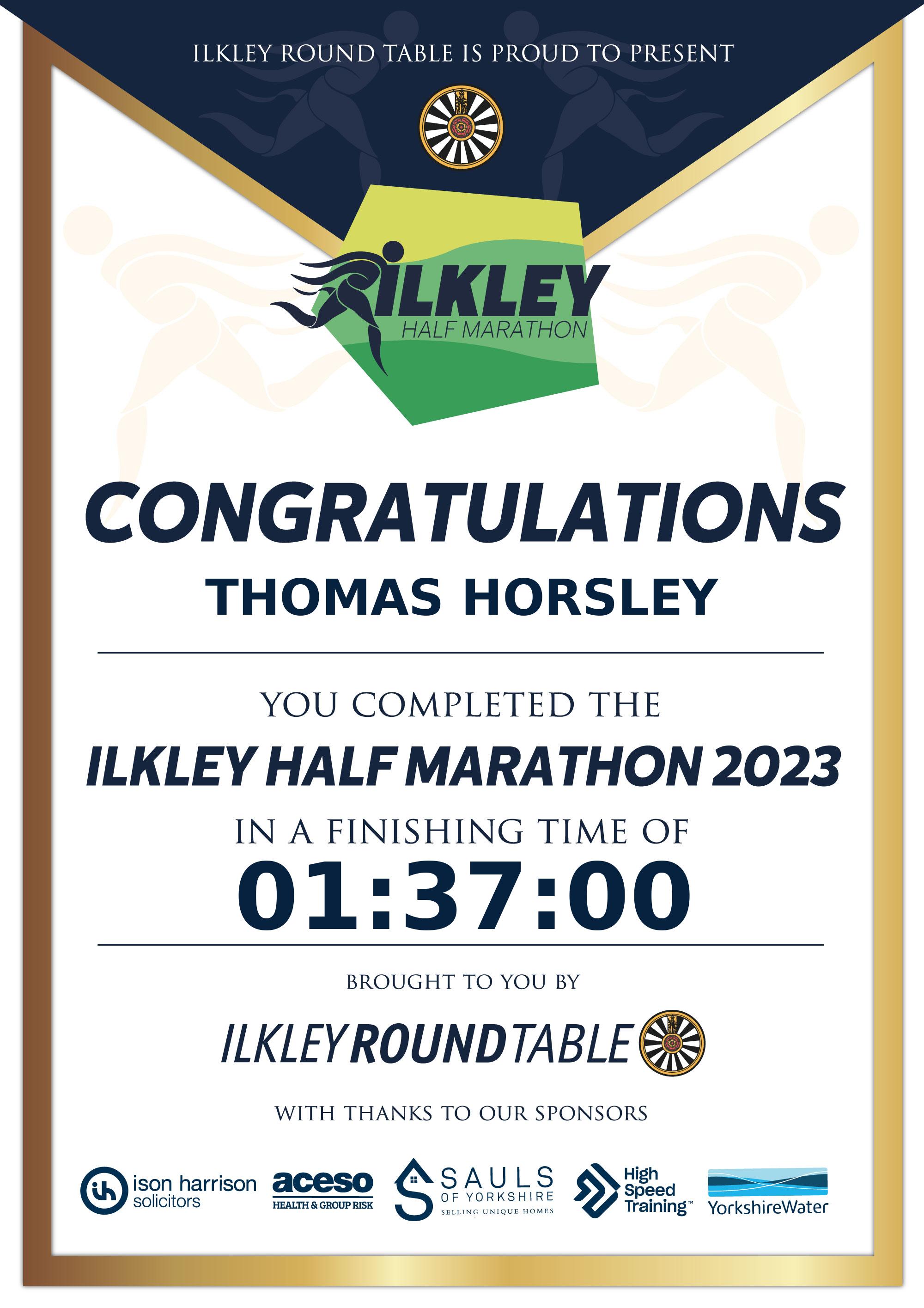 Congratulations Thomas Horsley after completing The Ilkley Half Marathon 2023 why not remember your accomplishment by purchasing our unique professionally printed, high quality 11oz race results mug. Keep that lasting memory forever. All of our race mugs mugs are personally designed and made to order and ready to deliver within 5–10 business days. Although our mugs are dishwasher safe the high temperatures of the dishwasher can fade the images. We advise handwashing only.Delivery is £3.50 Includes P&P. We only deliver within the UK