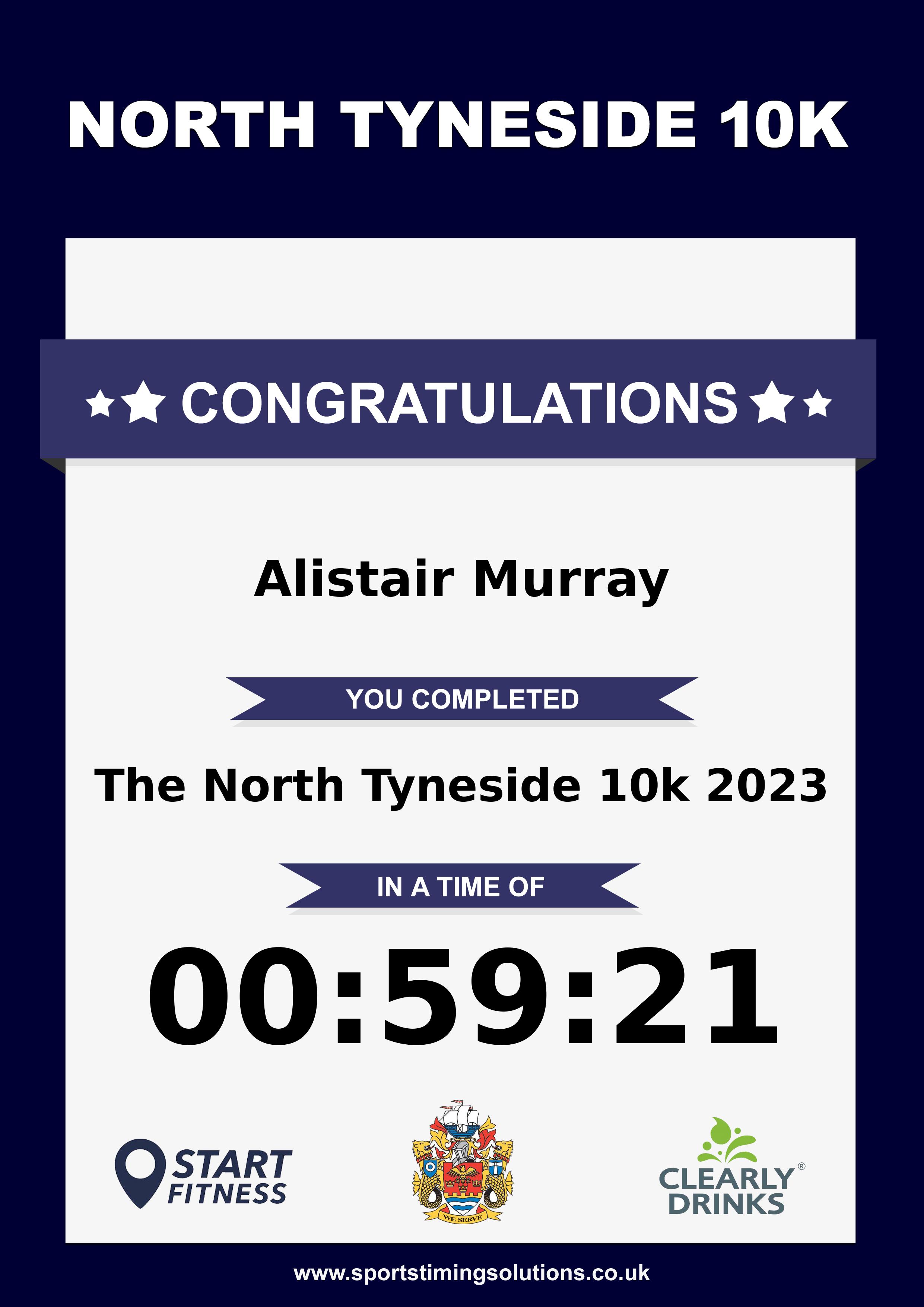 Congratulations Alistair Murray after completing The North Tyneside 10k 2023 why not remember your accomplishment by purchasing our unique professionally printed, high quality 11oz race results mug. Keep that lasting memory forever. All of our race mugs mugs are personally designed and made to order and ready to deliver within 5–10 business days. Although our mugs are dishwasher safe the high temperatures of the dishwasher can fade the images. We advise handwashing only.Delivery is £3.50 Includes P&P. We only deliver within the UK