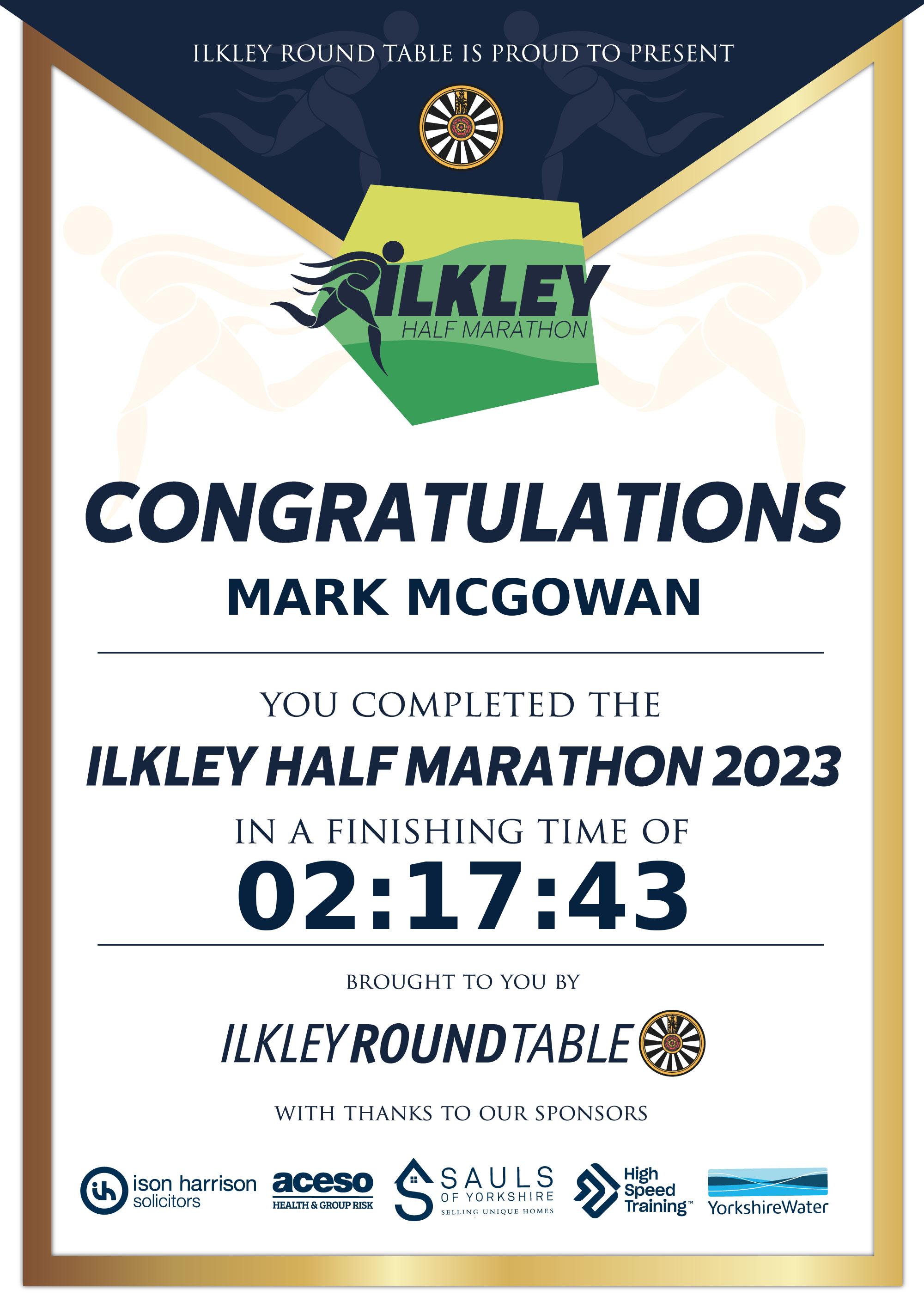 Congratulations Mark Mcgowan after completing The Ilkley Half Marathon 2023 why not remember your accomplishment by purchasing our unique professionally printed, high quality 11oz race results mug. Keep that lasting memory forever. All of our race mugs mugs are personally designed and made to order and ready to deliver within 5–10 business days. Although our mugs are dishwasher safe the high temperatures of the dishwasher can fade the images. We advise handwashing only.Delivery is £3.50 Includes P&P. We only deliver within the UK
