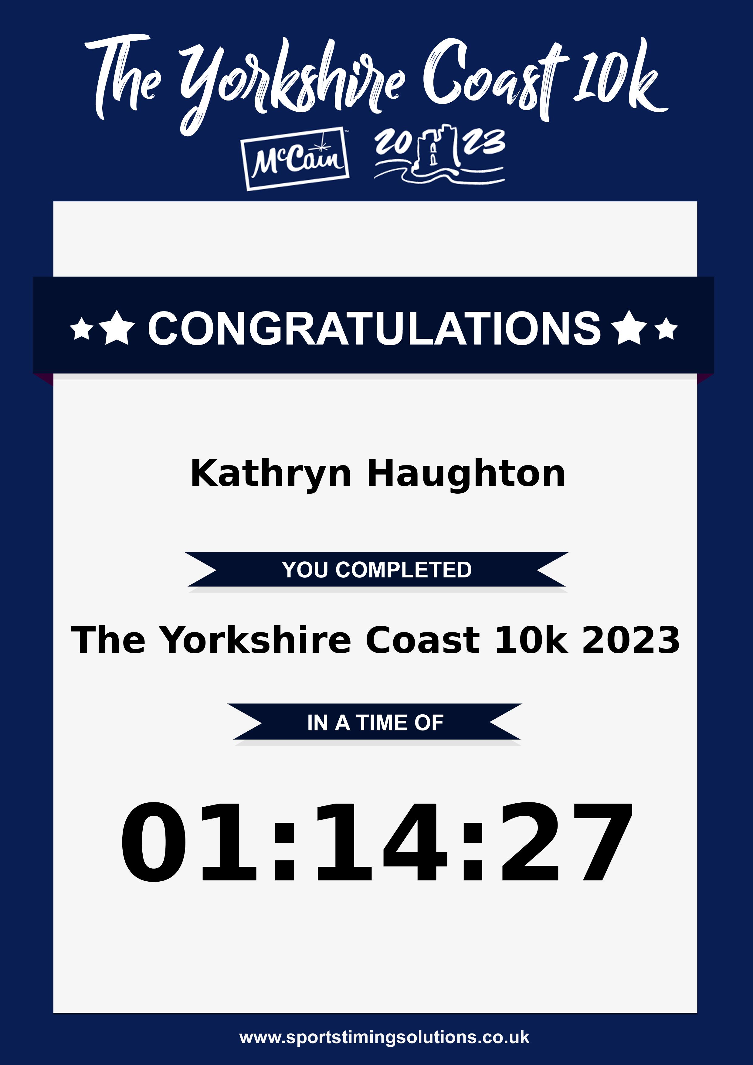Congratulations Kathryn Haughton after completing The Yorkshire Coast 10k 2023 why not remember your accomplishment by purchasing our unique professionally printed, high quality 11oz race results mug. Keep that lasting memory forever. All of our race mugs mugs are personally designed and made to order and ready to deliver within 5–10 business days. Although our mugs are dishwasher safe the high temperatures of the dishwasher can fade the images. We advise handwashing only.Delivery is £3.50 Includes P&P. We only deliver within the UK