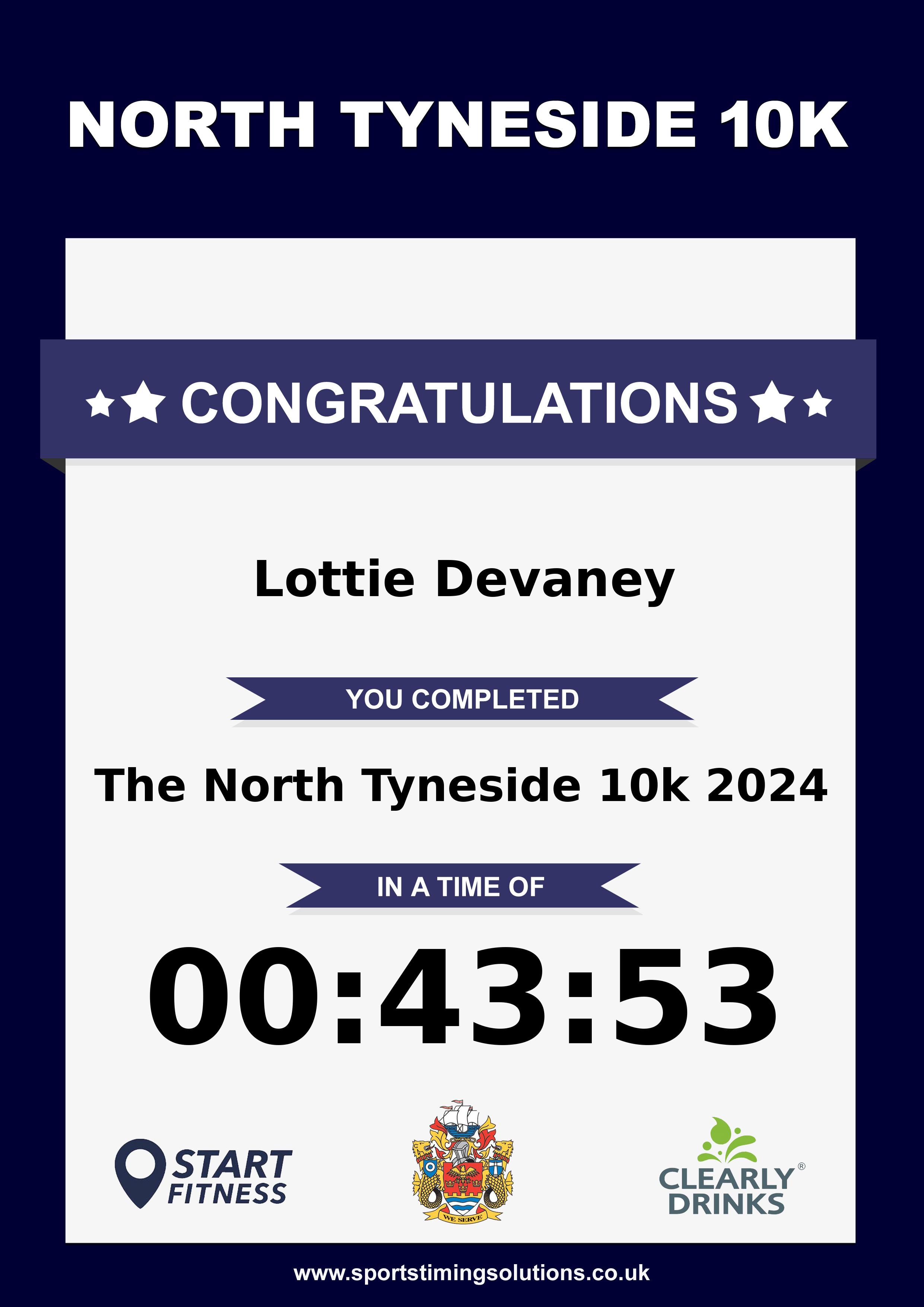 Congratulations Lottie Devaney after completing The North Tyneside 10k 2024 why not remember your accomplishment by purchasing our unique professionally printed, high quality 11oz race results mug. Keep that lasting memory forever. All of our race mugs mugs are personally designed and made to order and ready to deliver within 5–10 business days. Although our mugs are dishwasher safe the high temperatures of the dishwasher can fade the images. We advise handwashing only.Delivery is £3.50 Includes P&P. We only deliver within the UK