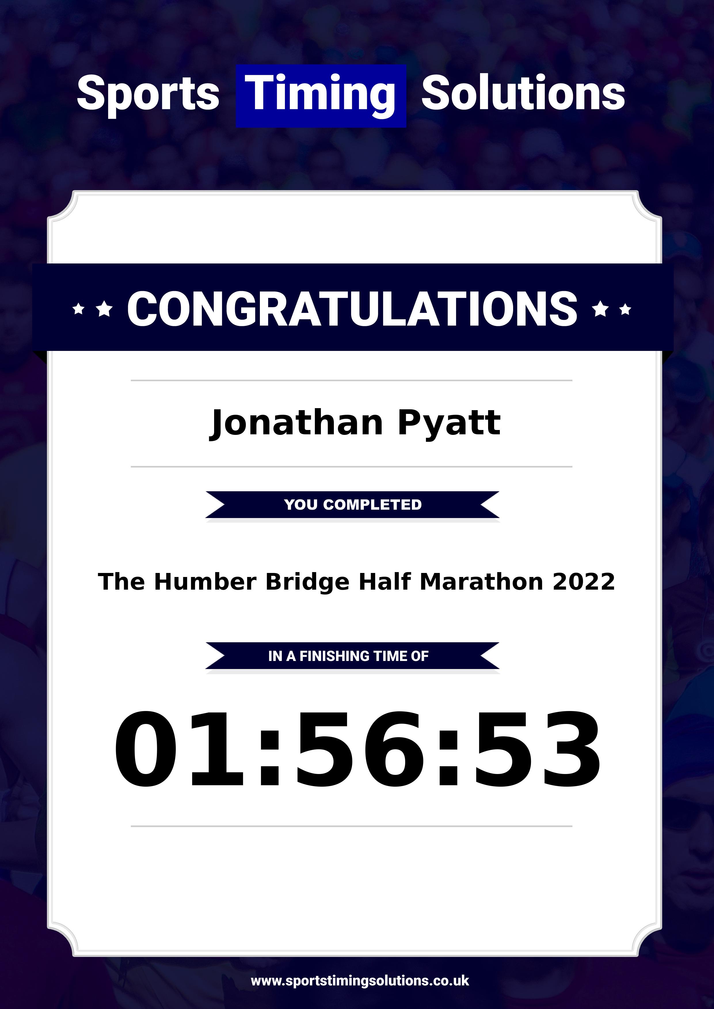 Congratulations Jonathan Pyatt after completing The Humber Bridge Half Marathon 2022 why not remember your accomplishment by purchasing our unique professionally printed, high quality 11oz race results mug. Keep that lasting memory forever. All of our race mugs mugs are personally designed and made to order and ready to deliver within 5–10 business days. Although our mugs are dishwasher safe the high temperatures of the dishwasher can fade the images. We advise handwashing only.Delivery is £3.50 Includes P&P. We only deliver within the UK