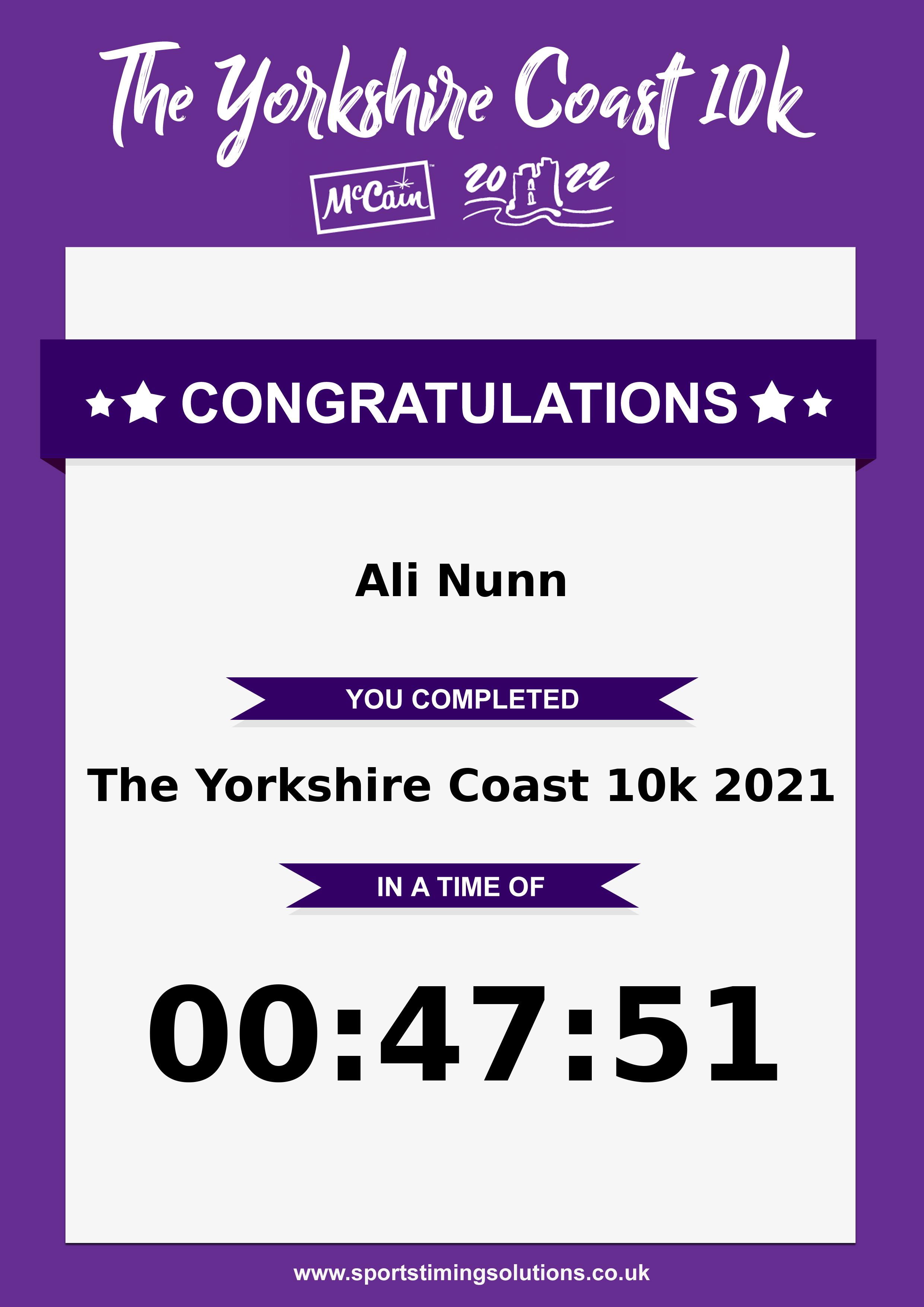 Congratulations Ali Nunn after completing The Yorkshire Coast 10k 2021 why not remember your accomplishment by purchasing our unique professionally printed, high quality 11oz race results mug. Keep that lasting memory forever. All of our race mugs mugs are personally designed and made to order and ready to deliver within 5–10 business days. Although our mugs are dishwasher safe the high temperatures of the dishwasher can fade the images. We advise handwashing only.Delivery is £3.50 Includes P&P. We only deliver within the UK
