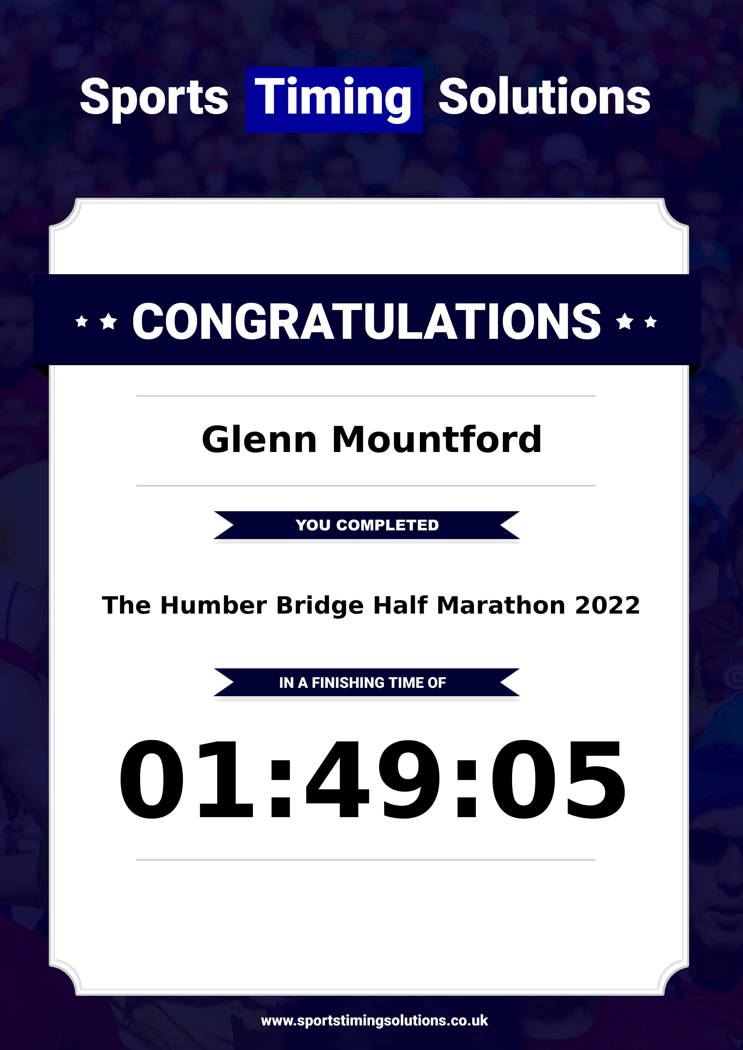 Congratulations Glenn Mountford after completing The Humber Bridge Half Marathon 2022 why not remember your accomplishment by purchasing our unique professionally printed, high quality 11oz race results mug. Keep that lasting memory forever. All of our race mugs mugs are personally designed and made to order and ready to deliver within 5–10 business days. Although our mugs are dishwasher safe the high temperatures of the dishwasher can fade the images. We advise handwashing only.Delivery is £3.50 Includes P&P. We only deliver within the UK