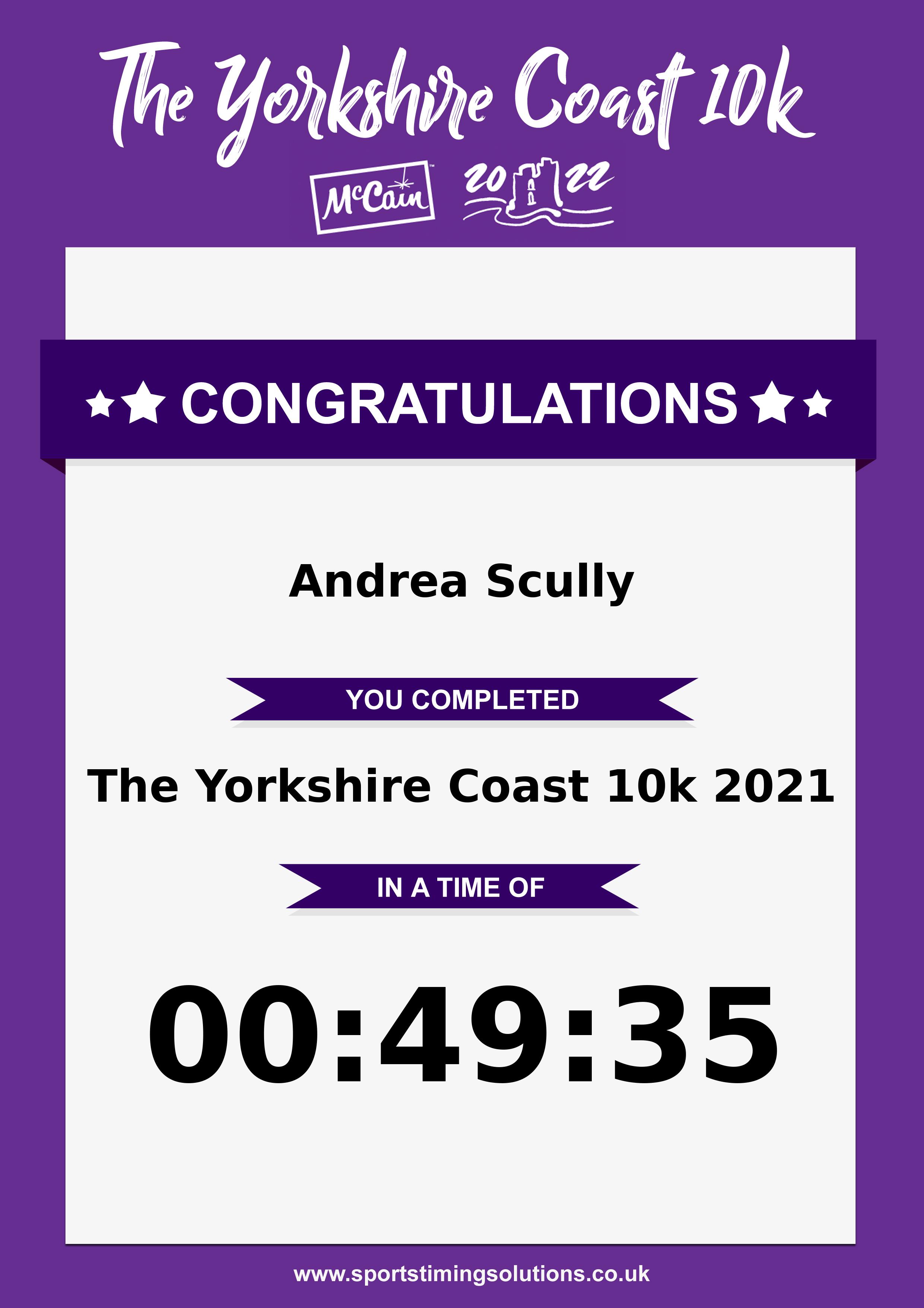 Congratulations Andrea Scully after completing The Yorkshire Coast 10k 2021 why not remember your accomplishment by purchasing our unique professionally printed, high quality 11oz race results mug. Keep that lasting memory forever. All of our race mugs mugs are personally designed and made to order and ready to deliver within 5–10 business days. Although our mugs are dishwasher safe the high temperatures of the dishwasher can fade the images. We advise handwashing only.Delivery is £3.50 Includes P&P. We only deliver within the UK