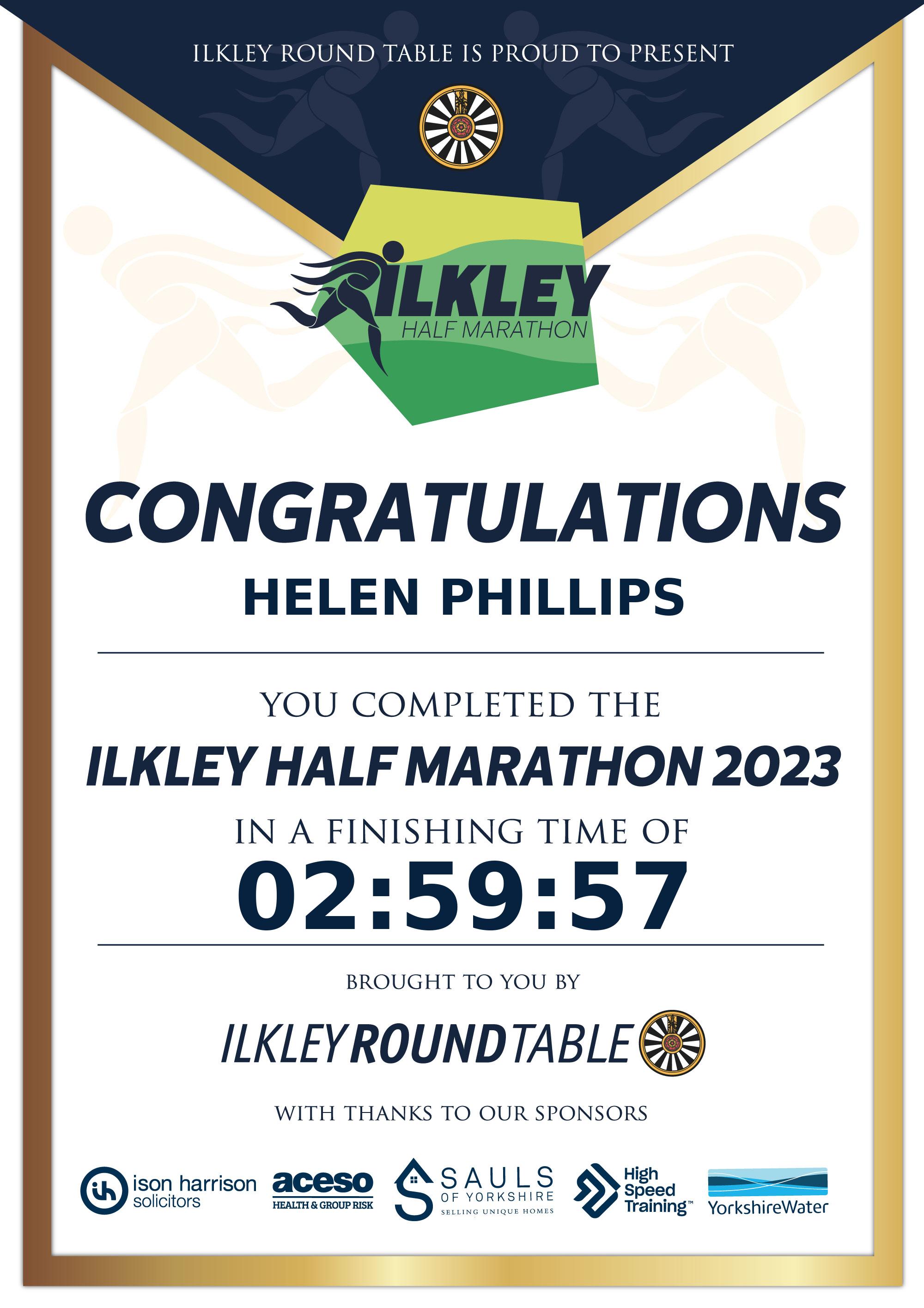 Congratulations Helen Phillips after completing The Ilkley Half Marathon 2023 why not remember your accomplishment by purchasing our unique professionally printed, high quality 11oz race results mug. Keep that lasting memory forever. All of our race mugs mugs are personally designed and made to order and ready to deliver within 5–10 business days. Although our mugs are dishwasher safe the high temperatures of the dishwasher can fade the images. We advise handwashing only.Delivery is £3.50 Includes P&P. We only deliver within the UK