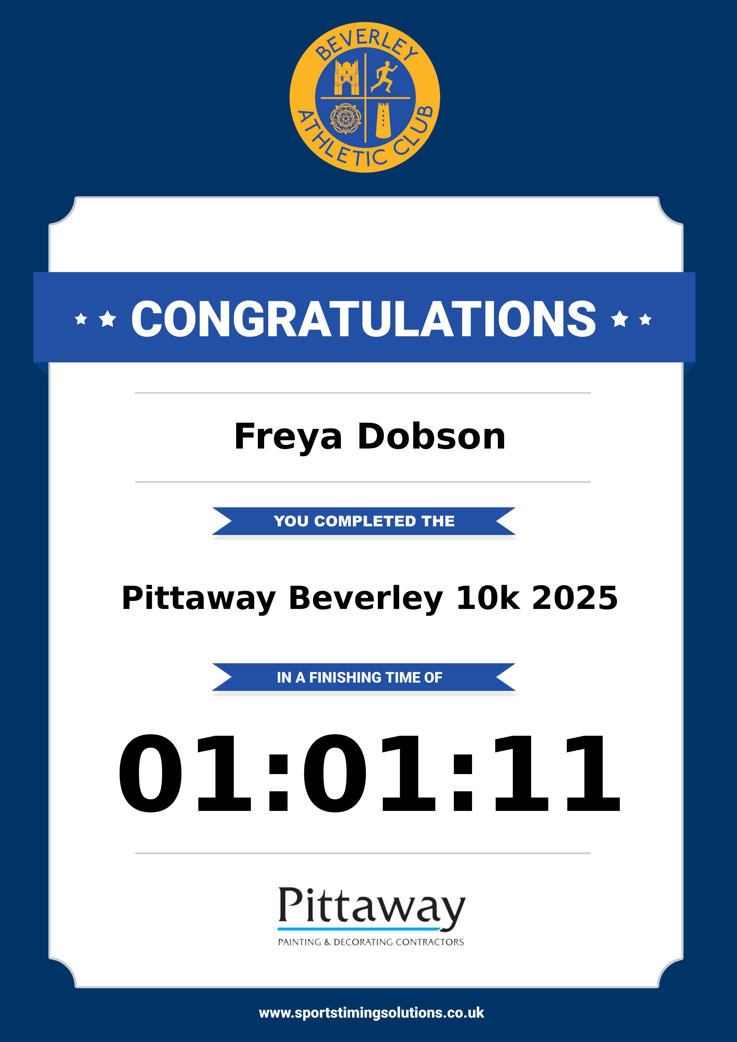 Congratulations Freya Dobson after completing Pittaway Beverley 10k 2025 why not remember your accomplishment by purchasing our unique professionally printed, high quality 11oz race results mug. Keep that lasting memory forever. All of our race mugs mugs are personally designed and made to order and ready to deliver within 5–10 business days. Although our mugs are dishwasher safe the high temperatures of the dishwasher can fade the images. We advise handwashing only.Delivery is £3.50 Includes P&P. We only deliver within the UK