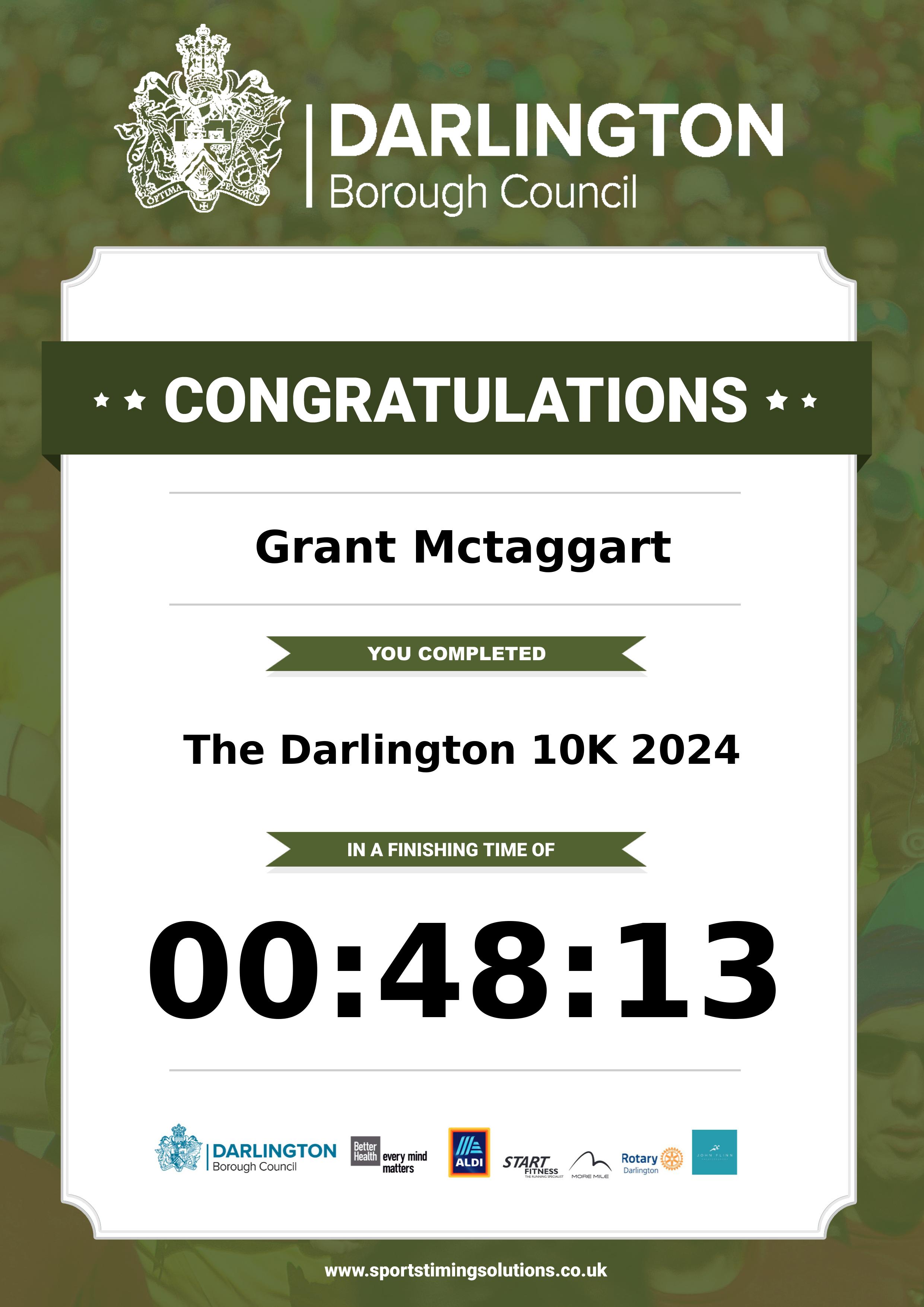 Congratulations Grant Mctaggart after completing The Darlington 10K 2024 why not remember your accomplishment by purchasing our unique professionally printed, high quality 11oz race results mug. Keep that lasting memory forever. All of our race mugs mugs are personally designed and made to order and ready to deliver within 5–10 business days. Although our mugs are dishwasher safe the high temperatures of the dishwasher can fade the images. We advise handwashing only.Delivery is £3.50 Includes P&P. We only deliver within the UK