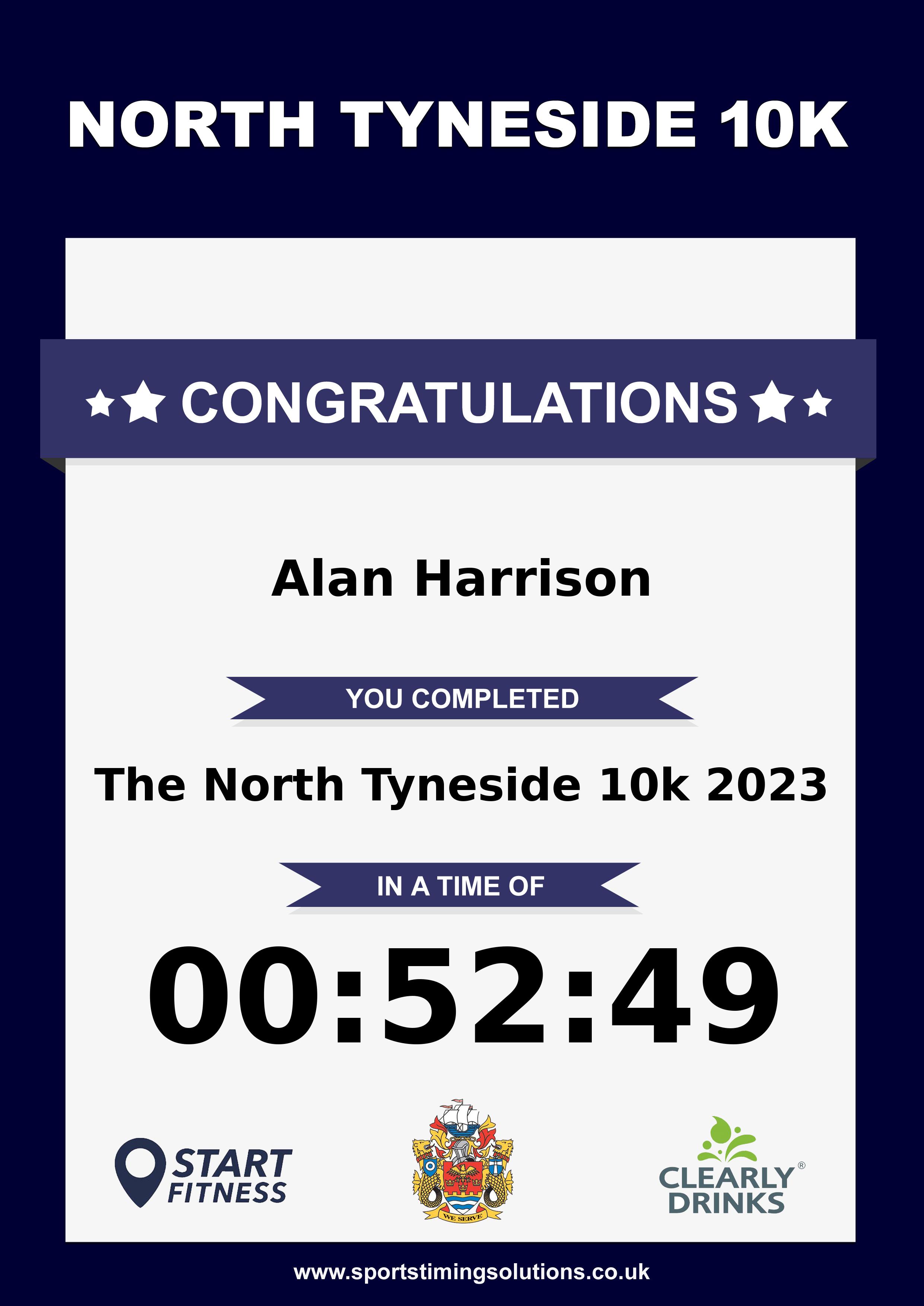 Congratulations Alan Harrison after completing The North Tyneside 10k 2023 why not remember your accomplishment by purchasing our unique professionally printed, high quality 11oz race results mug. Keep that lasting memory forever. All of our race mugs mugs are personally designed and made to order and ready to deliver within 5–10 business days. Although our mugs are dishwasher safe the high temperatures of the dishwasher can fade the images. We advise handwashing only.Delivery is £3.50 Includes P&P. We only deliver within the UK