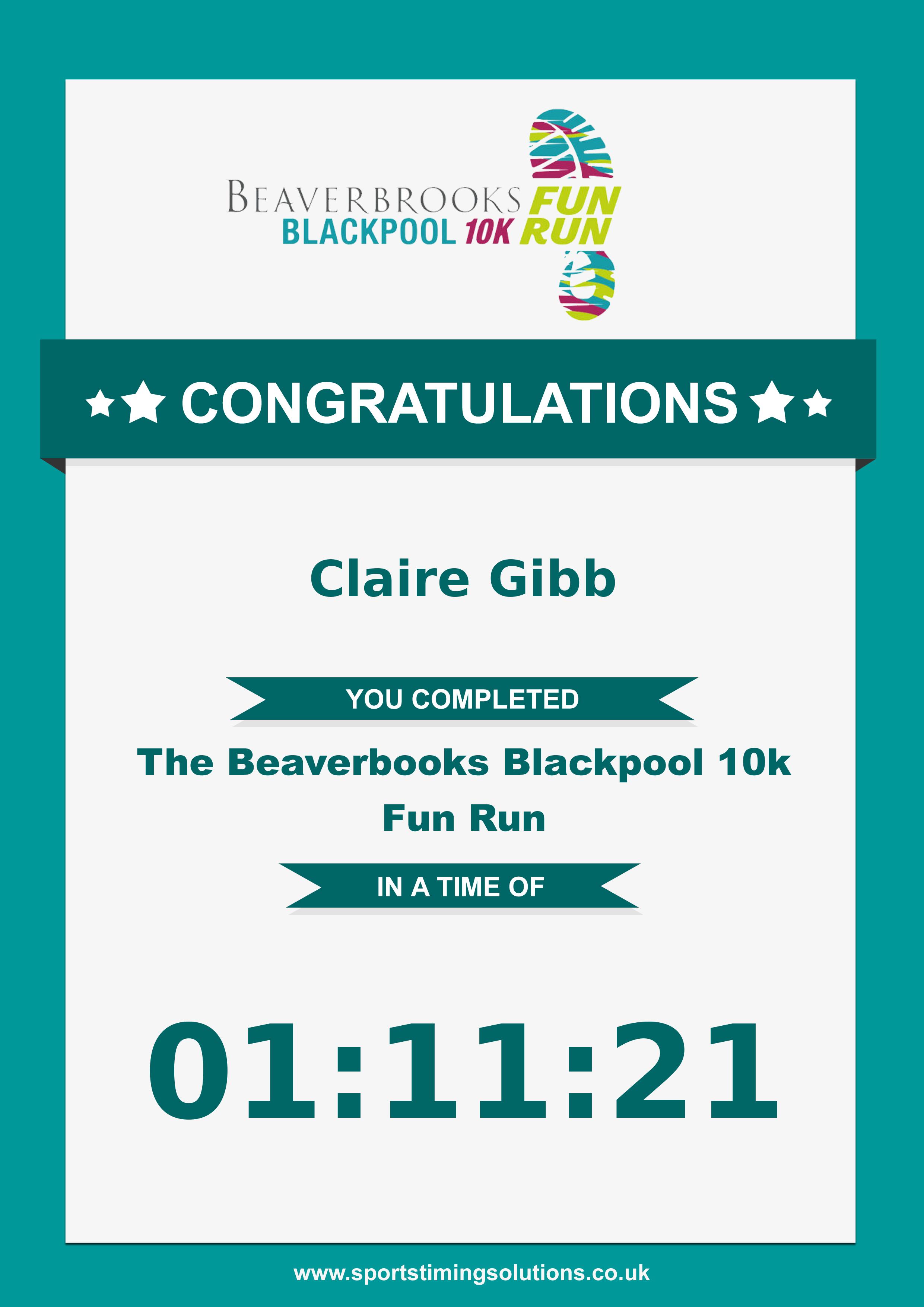 Congratulations Claire Gibb after completing Beaverbrooks Blackpool 10k Fun Run 2023 why not remember your accomplishment by purchasing our unique professionally printed, high quality 11oz race results mug. Keep that lasting memory forever. All of our race mugs mugs are personally designed and made to order and ready to deliver within 5–10 business days. Although our mugs are dishwasher safe the high temperatures of the dishwasher can fade the images. We advise handwashing only.Delivery is £3.50 Includes P&P. We only deliver within the UK