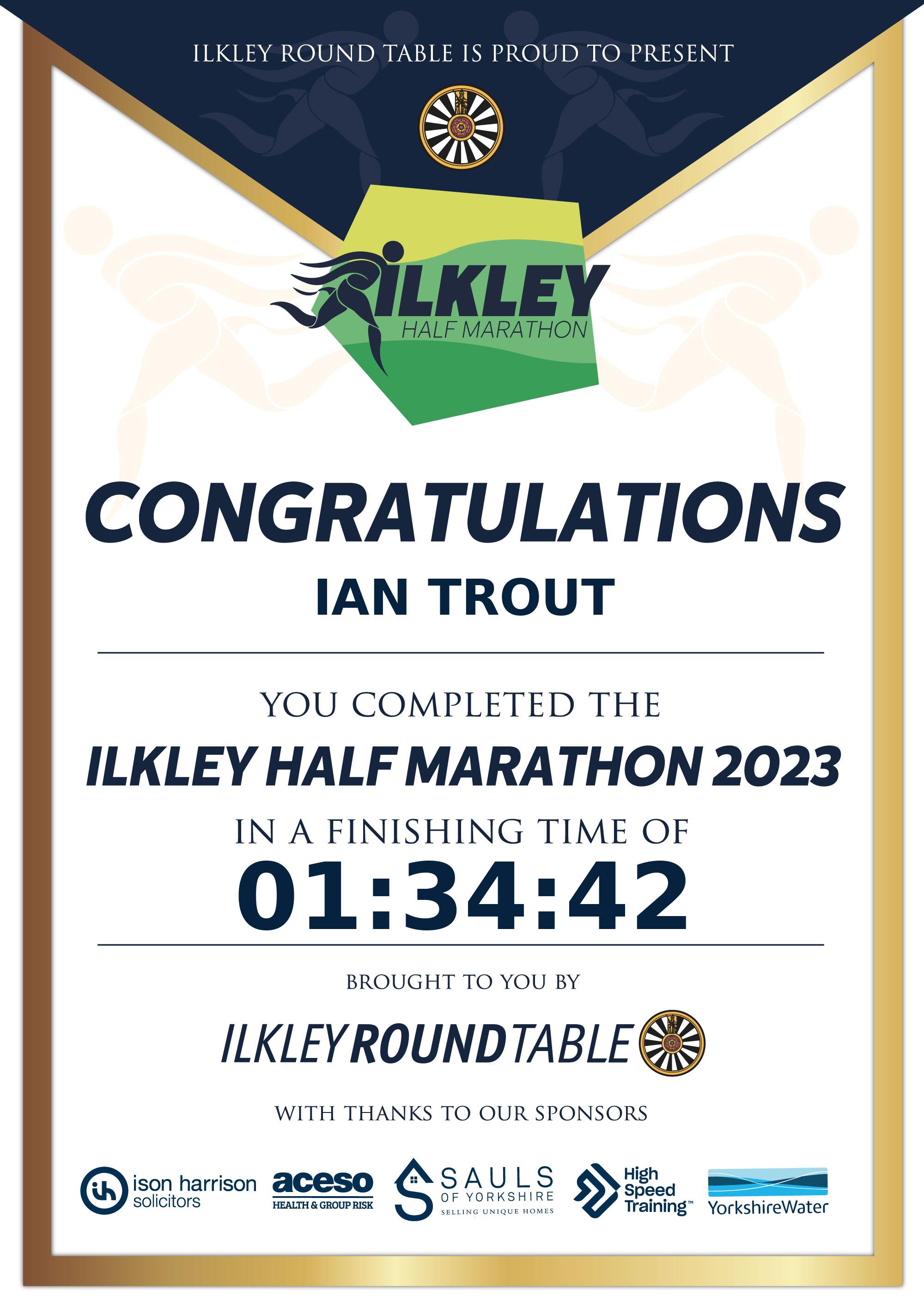 Congratulations Ian Trout after completing The Ilkley Half Marathon 2023 why not remember your accomplishment by purchasing our unique professionally printed, high quality 11oz race results mug. Keep that lasting memory forever. All of our race mugs mugs are personally designed and made to order and ready to deliver within 5–10 business days. Although our mugs are dishwasher safe the high temperatures of the dishwasher can fade the images. We advise handwashing only.Delivery is £3.50 Includes P&P. We only deliver within the UK
