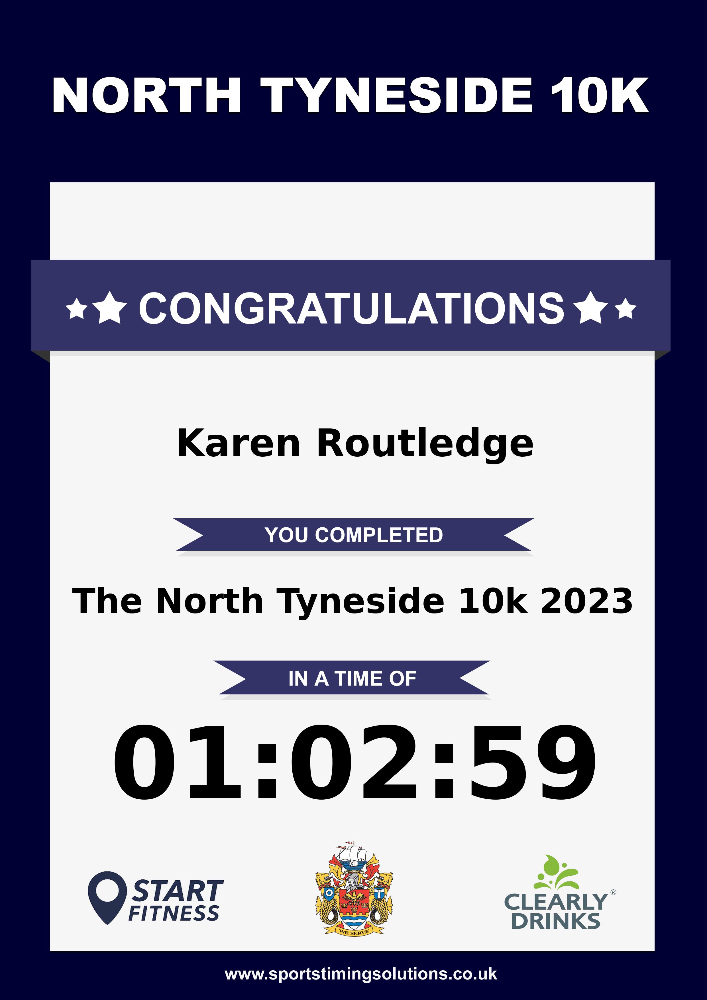 Congratulations Karen Routledge after completing The North Tyneside 10k 2023 why not remember your accomplishment by purchasing our unique professionally printed, high quality 11oz race results mug. Keep that lasting memory forever. All of our race mugs mugs are personally designed and made to order and ready to deliver within 5–10 business days. Although our mugs are dishwasher safe the high temperatures of the dishwasher can fade the images. We advise handwashing only.Delivery is £3.50 Includes P&P. We only deliver within the UK