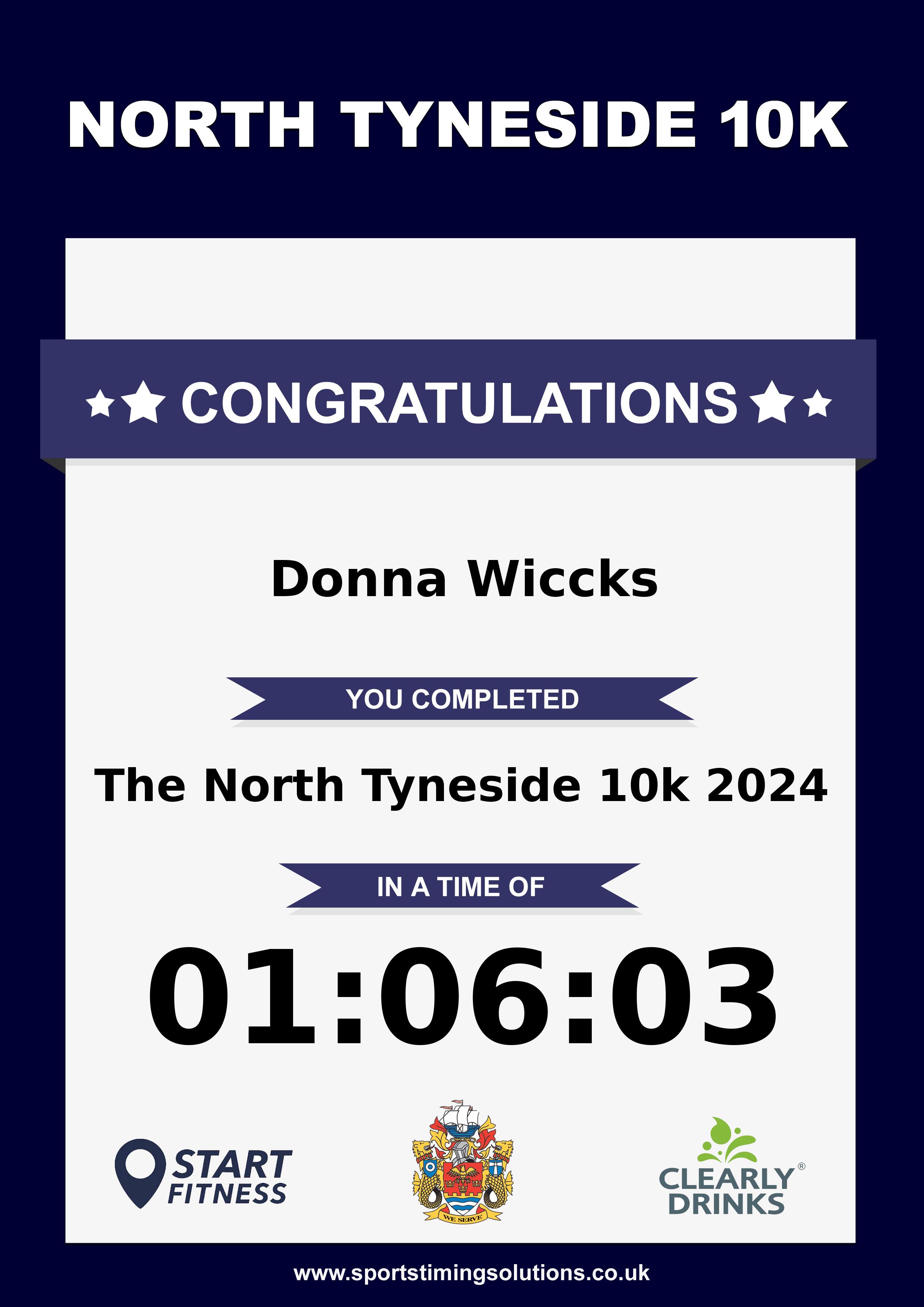 Congratulations Donna Wiccks after completing The North Tyneside 10k 2024 why not remember your accomplishment by purchasing our unique professionally printed, high quality 11oz race results mug. Keep that lasting memory forever. All of our race mugs mugs are personally designed and made to order and ready to deliver within 5–10 business days. Although our mugs are dishwasher safe the high temperatures of the dishwasher can fade the images. We advise handwashing only.Delivery is £3.50 Includes P&P. We only deliver within the UK