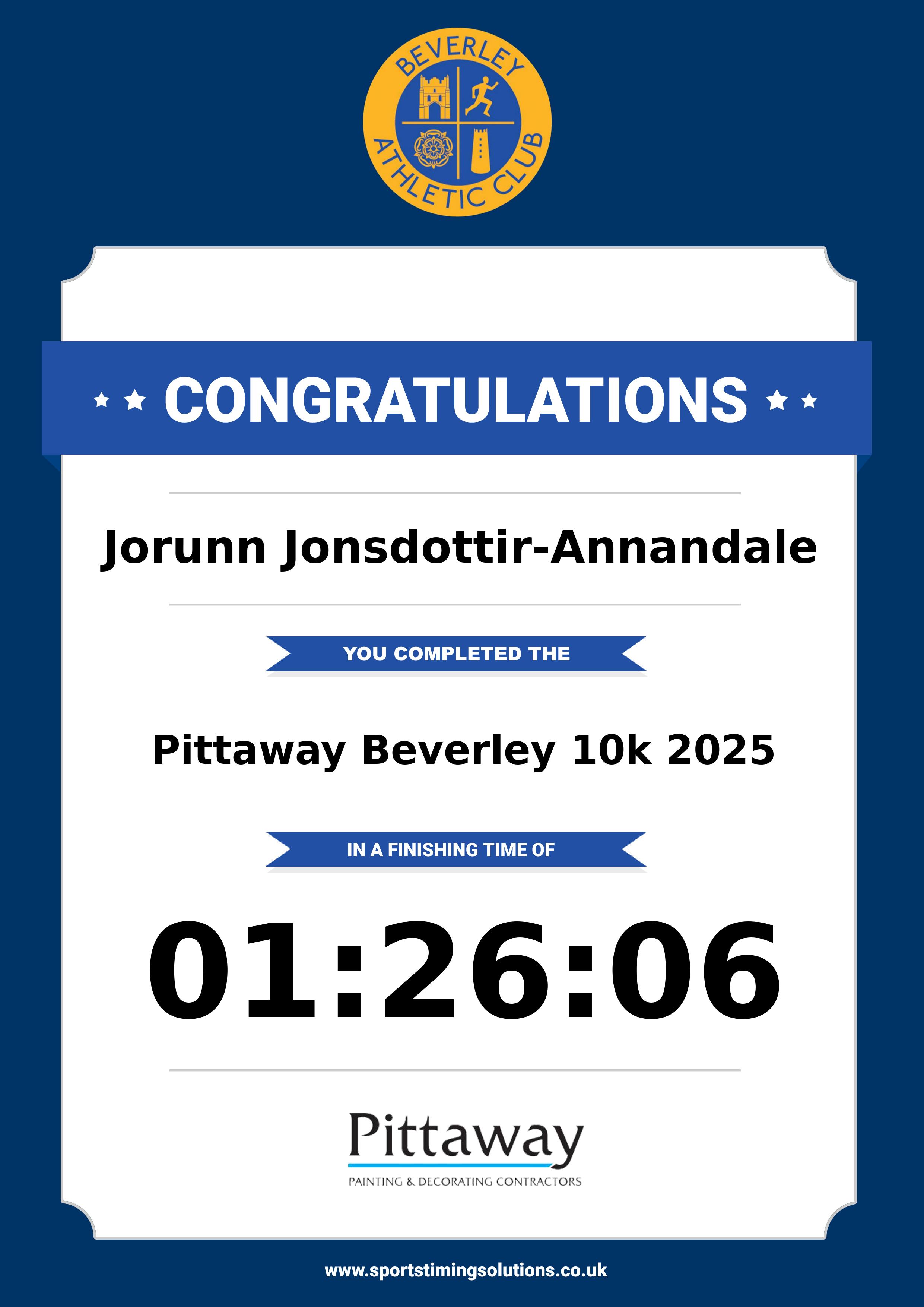 Congratulations Jorunn Jonsdottir-Annandale after completing Pittaway Beverley 10k 2025 why not remember your accomplishment by purchasing our unique professionally printed, high quality 11oz race results mug. Keep that lasting memory forever. All of our race mugs mugs are personally designed and made to order and ready to deliver within 5–10 business days. Although our mugs are dishwasher safe the high temperatures of the dishwasher can fade the images. We advise handwashing only.Delivery is £3.50 Includes P&P. We only deliver within the UK
