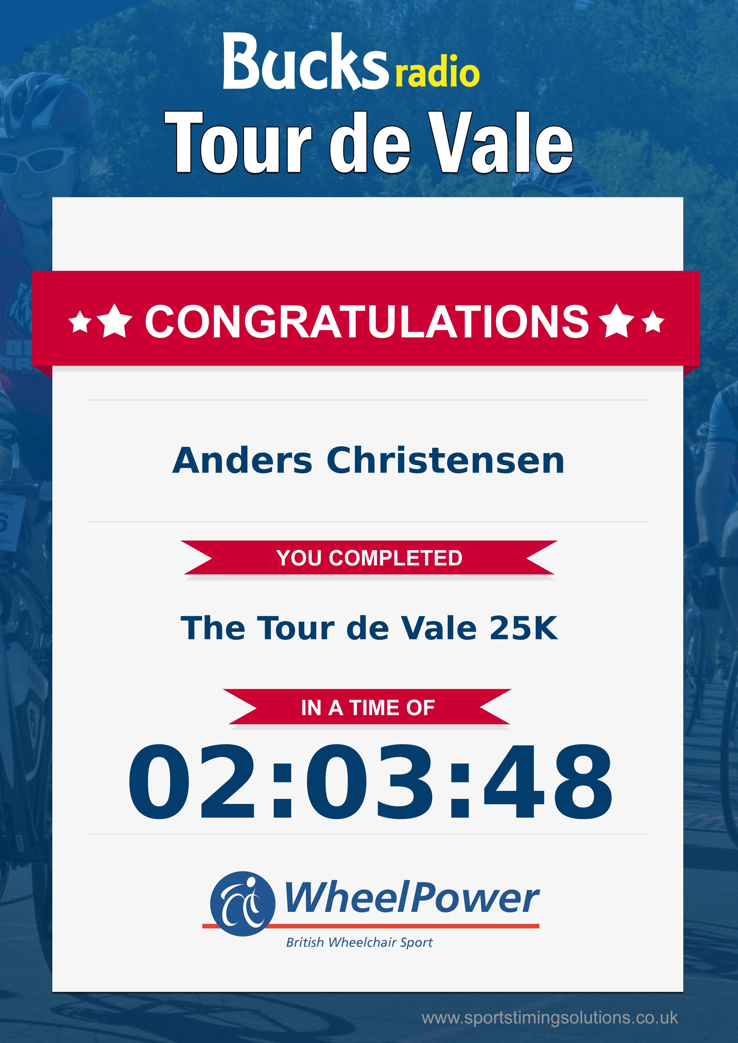 Congratulations Anders Christensen after completing The Bucks Radio Tour De Vale Charity Bike Ride 2024 why not remember your accomplishment by purchasing a professionally printed, high quality 11oz mug. Keep that lasting memory forever.
