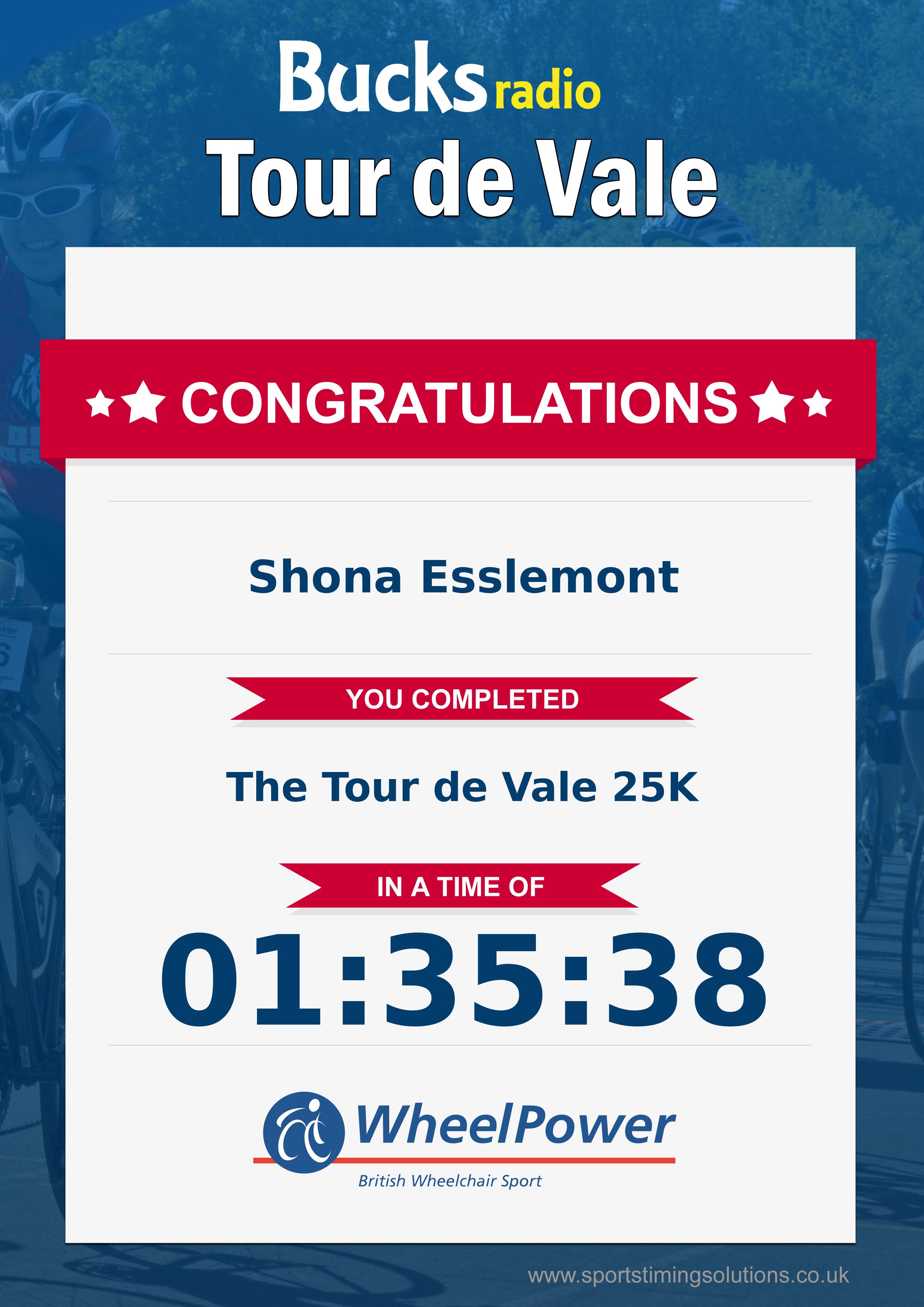 Congratulations Shona Esslemont after completing The Bucks Radio Tour De Vale Charity Bike Ride 2024 why not remember your accomplishment by purchasing a professionally printed, high quality 11oz mug. Keep that lasting memory forever.